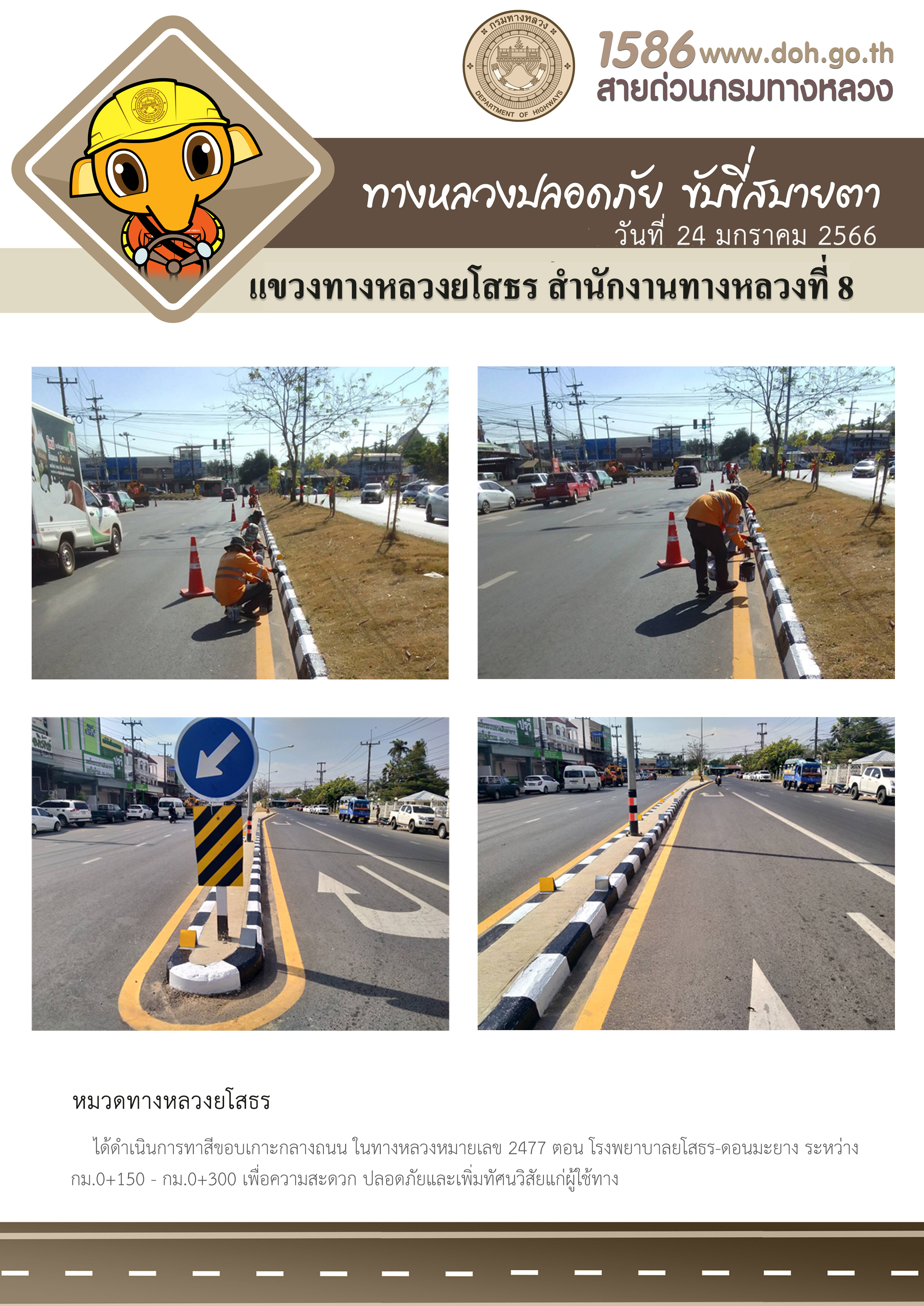 วันที่ 24 มกราคม 2566 หมวดทางหลวงยโสธร ได้ดำเนินการทาสีขอบเกาะกลางถนน ในทางหลวงหมายเลข 2477 ตอน โรงพยาบาลยโสธร-ดอนมะยาง ระหว่าง กม.0+150 - กม.0+300 เพื่อความสะดวก ปลอดภัยและเพิ่มทัศนวิสัยแก่ผู้ใช้ทาง