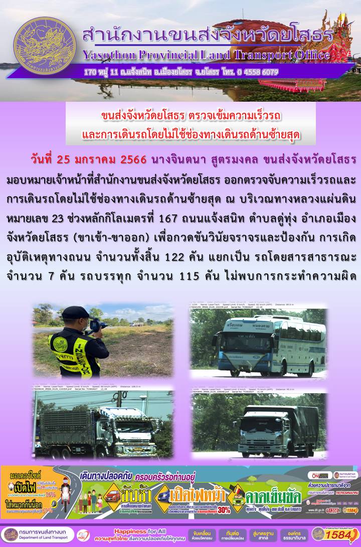 วันที่ 25 มกราคม 2566 เจ้าหน้าที่สำนักงานขนส่งจังหวัดยโสธร ออกตั้งจุดตรวจจับความเร็ว