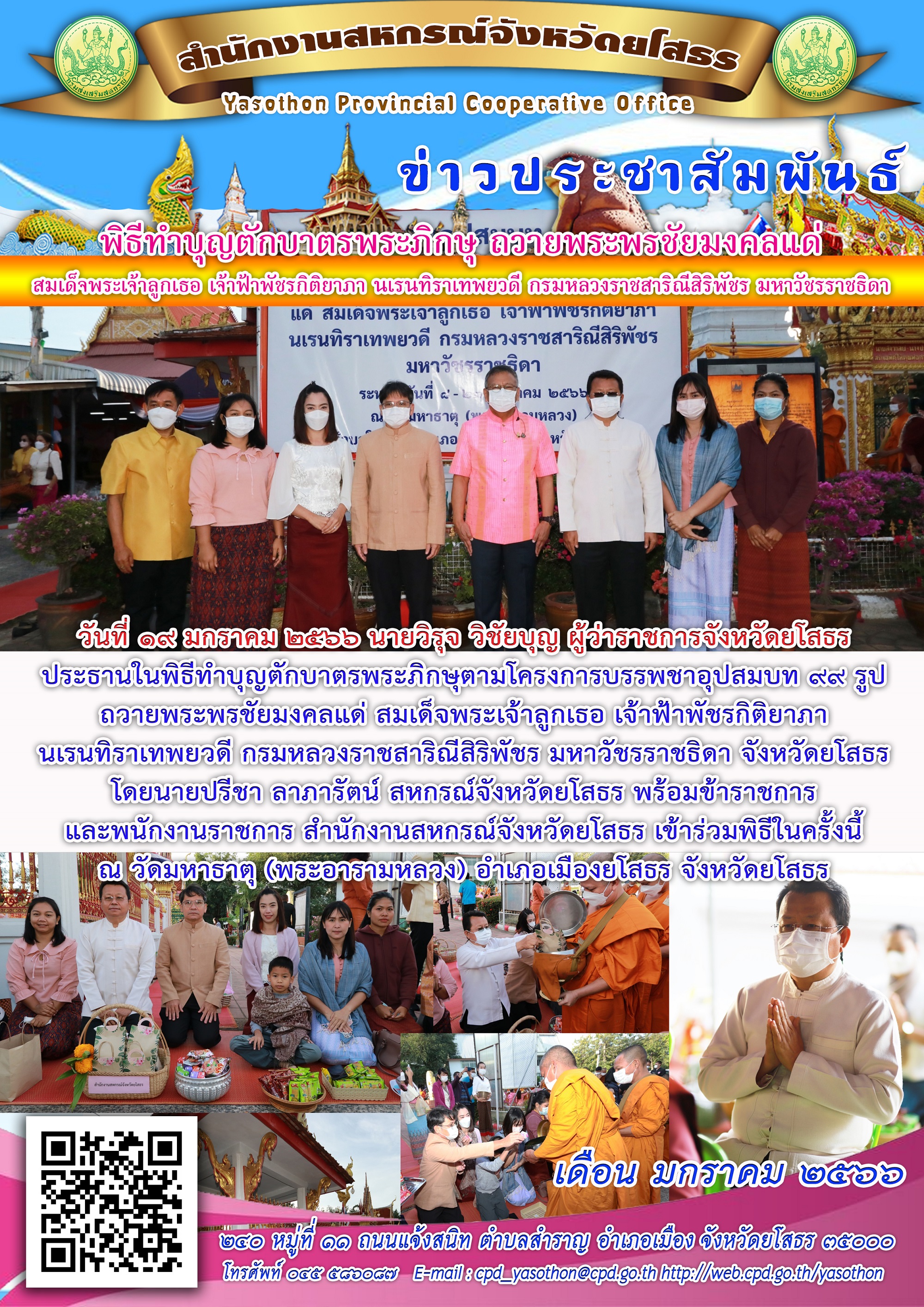 นายปรีชา ลาภารัตน์ สหกรณ์จังหวัดยโสธร ร่วมงานพิธีทำบุญตักบาตรพระภิิกษุตามโครงการบรรพชาอุปสมบท 99 รูป ถวายพระพรชัยมงคลแด่ สมเด็จพระเจ้าลูกเธอเจ้าฟ้าพัชรกิติยาภานเรนทิราเทพยวดีกรมหลวงราชสาริณีสิริพัชร มหาวัชรราชธิดา ณ วัดมหาธาตุ (พระอารามหลวง)