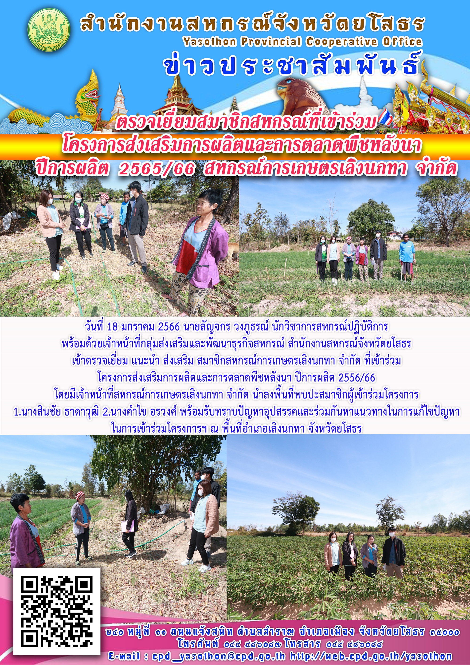 เจ้าหน้าที่สำนักงานสหกรณ์จังหวัดยโสธร เข้าตรวจเยี่ยมแนะนำ ส่งเสริมสมาชิกสหกรณ์การเกษตรเลิงนกทา จำกัด ที่เข้าร่วมโครงการส่งเสริมการผลิตและการตลาดพืชหลังนา ณ พื้นที่อำเภอเลิงนกทา