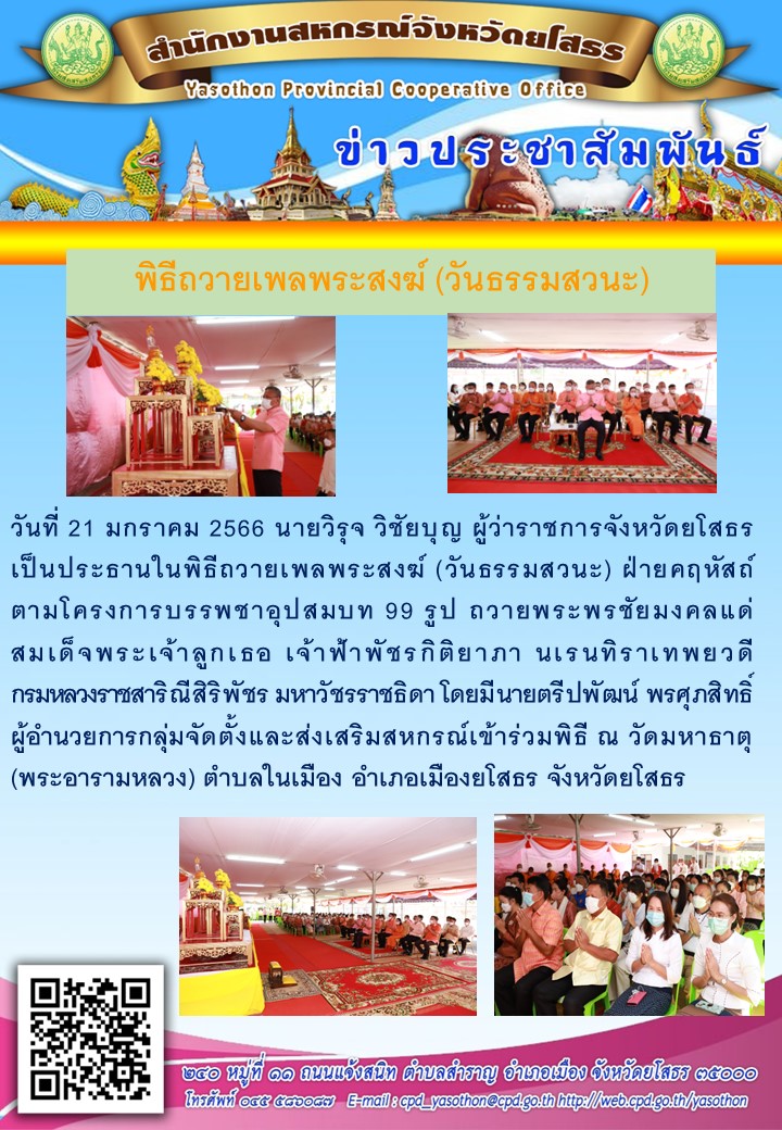 เจ้าหน้าที่สำนักงานสหกรณ์จังหวัดยโสธร เข้าร่วมโครงการบรรพชาอุปสมบทจำนวน 99 รูปถวายพระพรชัยมงคลแด่สมเด็จพระเจ้าลูกเธอ เจ้าฟ้าพัชรกิติยาภานเรนทิราเทพยวดีกรมหลวงราชสาริณีสิริพัชรมหาวัชรราชธิดา