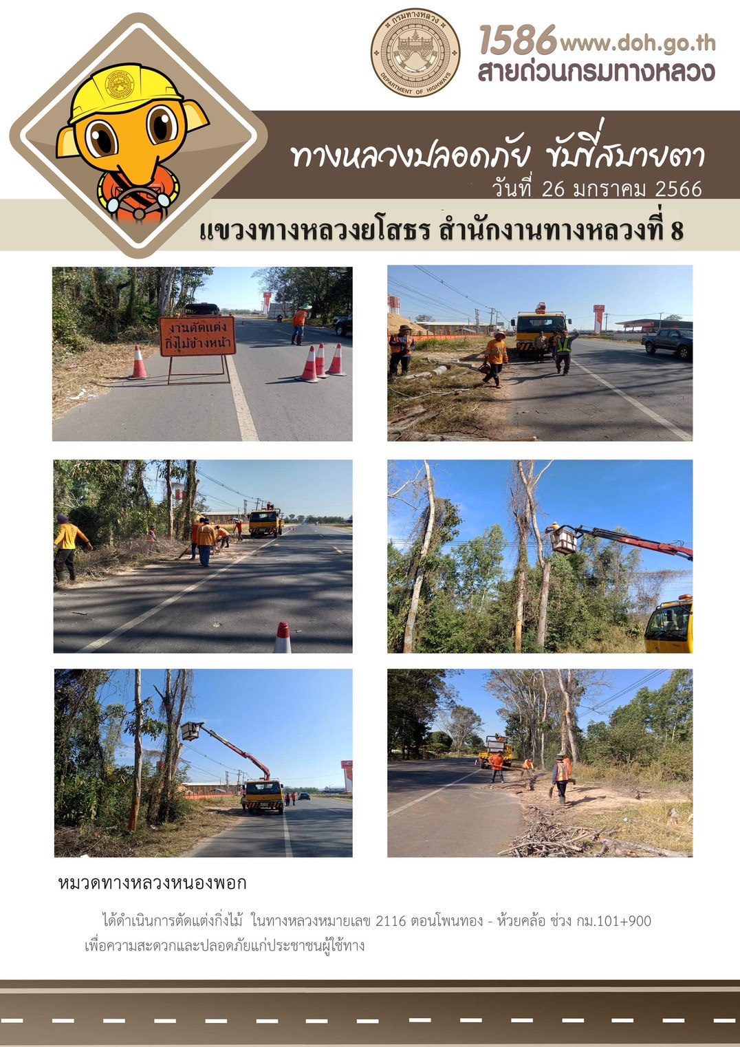 วันที่ 26 มกราคม 2566 หมวดทางหลวงหนองพอก ได้ดำเนินการตัดแต่งกิ่งไม้ ในทางหลวงหมายเลข 2116 ตอนโพนทอง - ห้วยคล้อ ช่วง กม.101+900 เพื่อความสะดวกและปลอดภัยแก่ประชาชนผู้ใช้ทาง