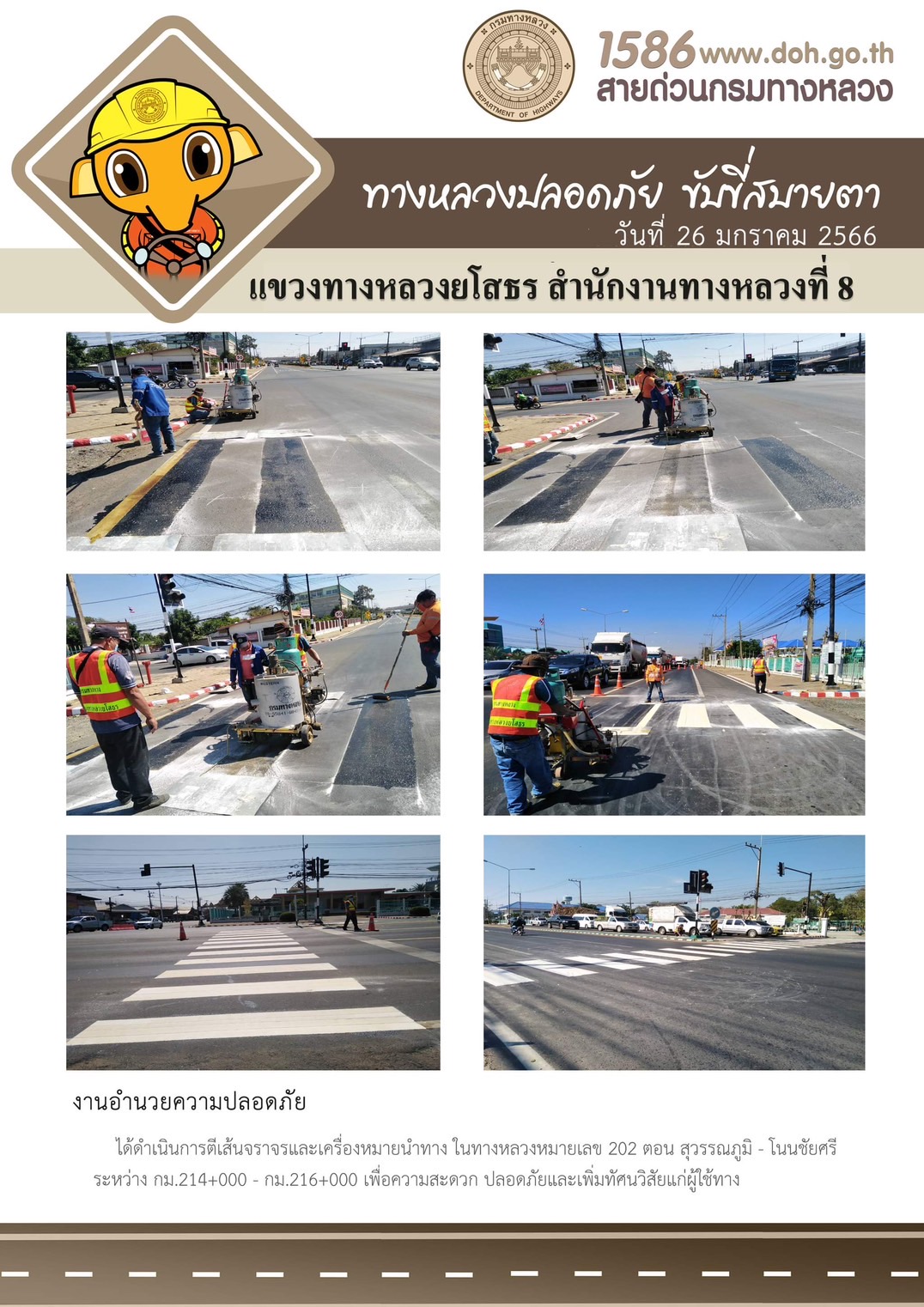 วันที่ 26 มกราคม 2566 งานอำนวยความปลอดภัย ได้ดำเนินการตีเส้นจราจรและเครื่องหมายนำทาง ในทางหลวงหมายเลข 202 ตอน สุวรรณภูมิ - โนนชัยศรี ระหว่าง กม.214+000 - กม.216+000 เพื่อความสะดวก ปลอดภัยและเพิ่มทัศนวิสัยแก่ผู้ใช้ทาง
