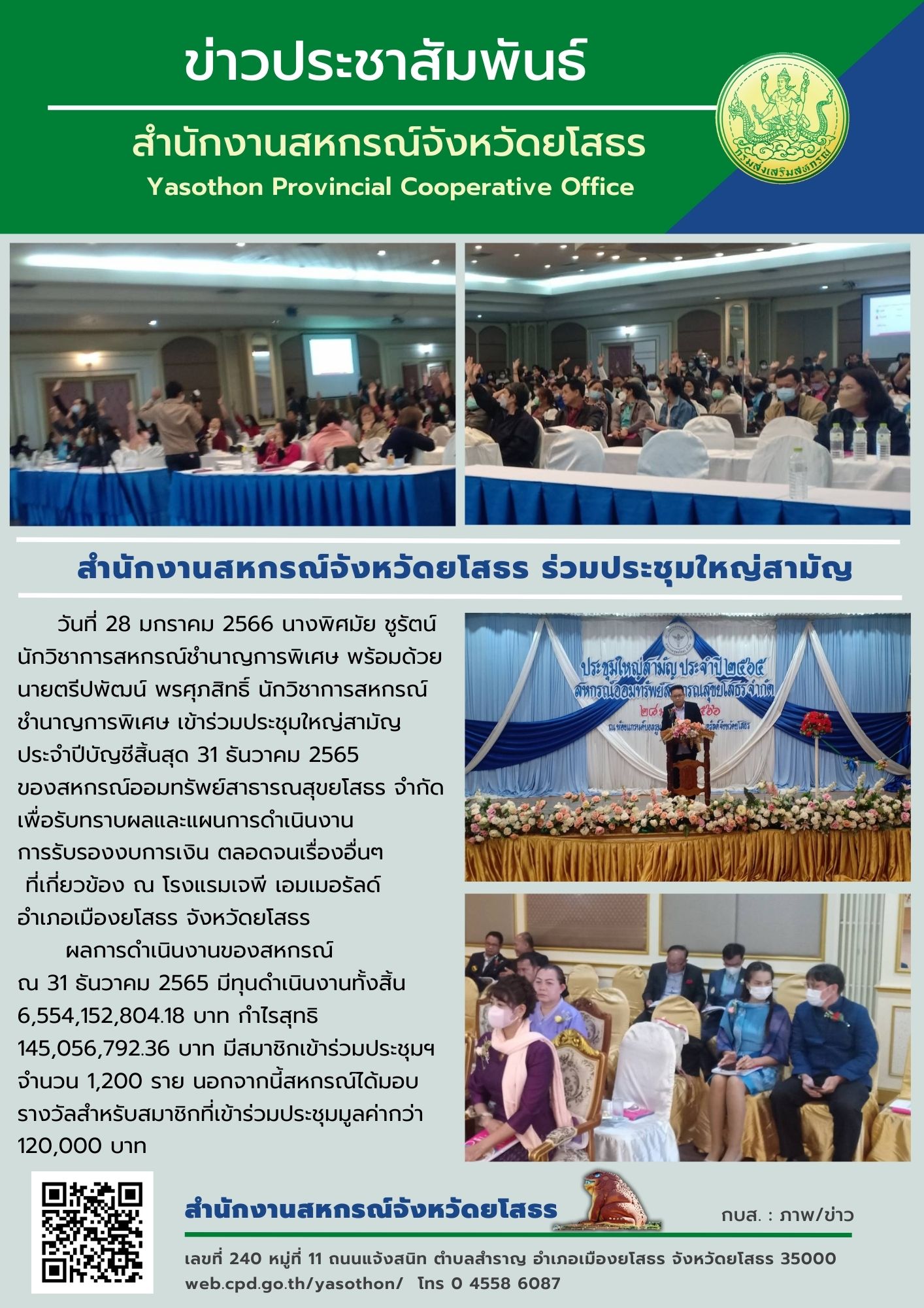 เจ้าหน้าที่สำนักงานสหกรณ์จังหวัดยโสธร เข้าร่วมประชุมใหญ่สามัญประจำปีบัญชีสิ้นสุด 31 ธันวาคม 2565 ของสหกรณ์ออมทรัพย์สาธารณสุขยโสธร จำกัด เพื่อรับทราบผลและแผนการดำเนินงานการรับรองงบการเงินตลอดจนเรื่องอื่นๆ ที่เกี่ยวข้องณ โรงแรมเจพี เอมเมอรัลด์