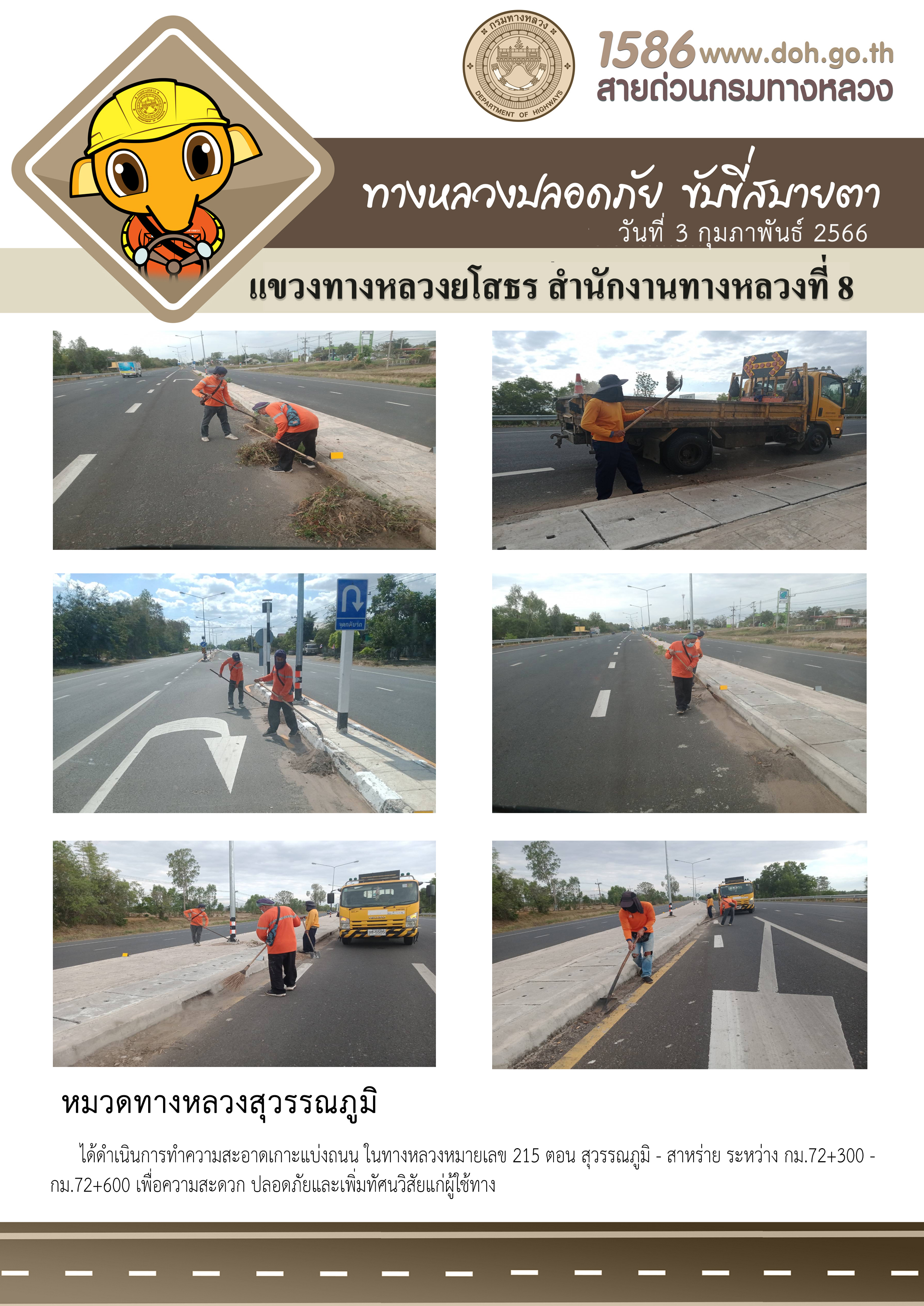 วันที่ 3 กุมภาพันธ์ 2566 หมวดทางหลวงสุวรรณภูมิ ได้ดำเนินการทำความสะอาดเกาะแบ่งถนน ในทางหลวงหมายเลข 215 ตอน สุวรรณภูมิ - สาหร่าย ระหว่าง กม.72+300 - กม.72+600 เพื่อความสะดวก ปลอดภัยและเพิ่มทัศนวิสัยแก่ผู้ใช้ทาง