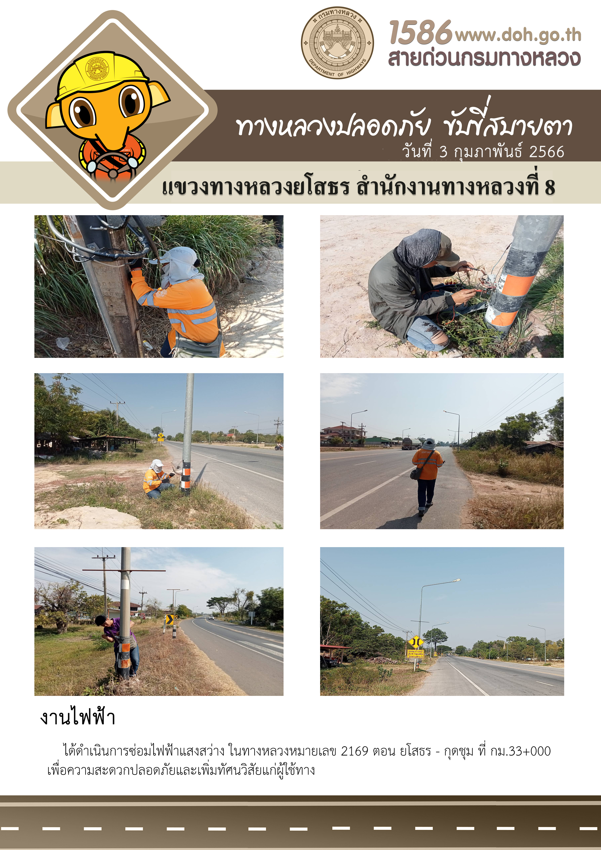 วันที่ 3 กุมภาพันธ์ 2566 งานไฟฟ้า ได้ดำเนินการซ่อมไฟฟ้าแสงสว่าง ในทางหลวงหมายเลข 2169 ตอน ยโสธร - กุดชุม ที่ กม.33+000 เพื่อความสะดวกปลอดภัยและเพิ่มทัศนวิสัยแก่ผู้ใช้ทาง
