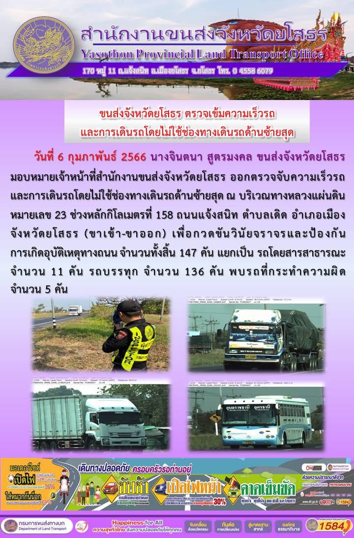 วันที่ 6 กุมภาพันธ์ 2566 เจ้าหน้าที่สำนักงานขนส่งจังหวัดยโสธร ออกตั้งจุดตรวจจับความเร็ว