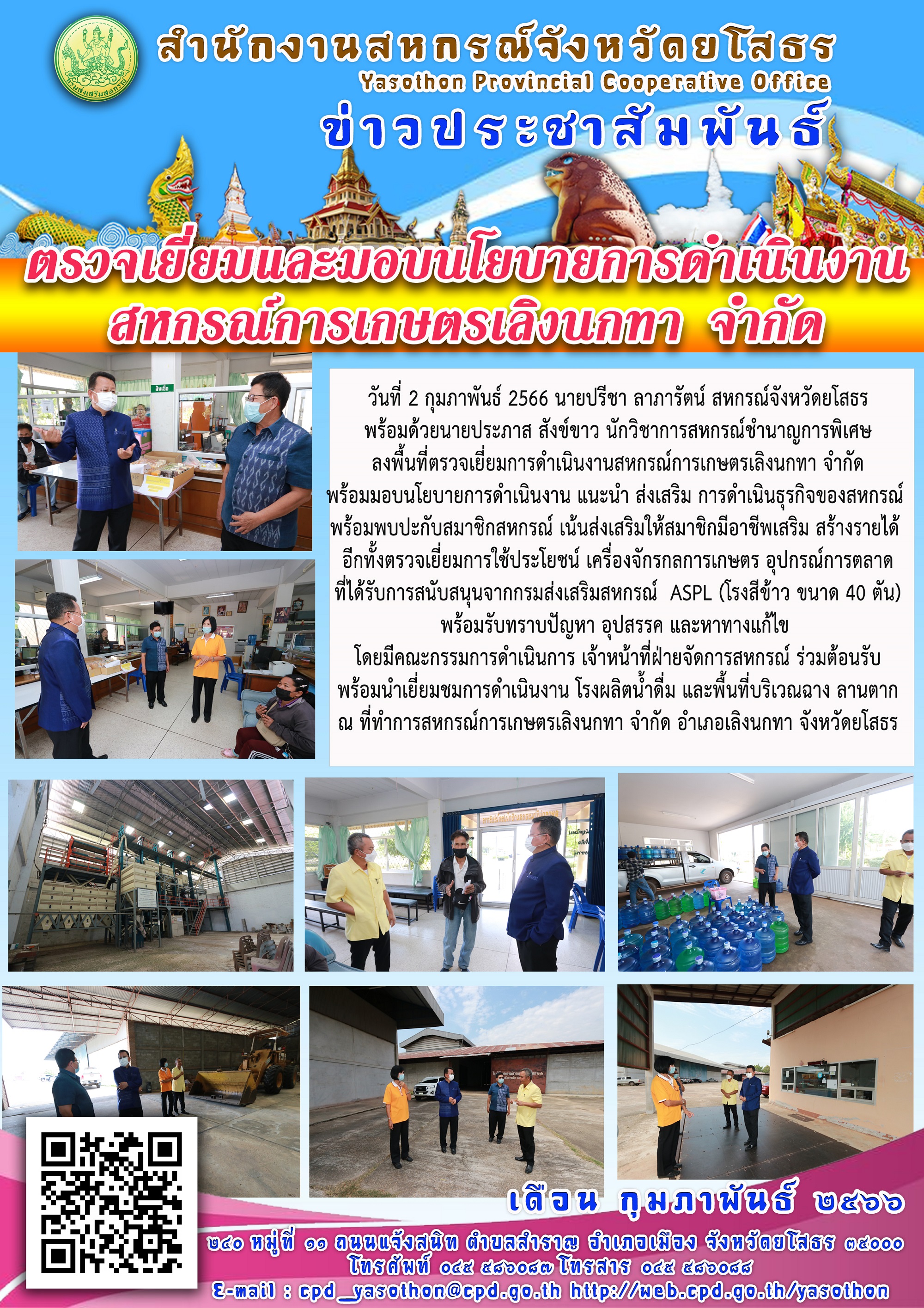 นายปรีชา ลาภารัตน์ สหกรณ์จังหวัดยโสธร พร้อมด้วยนายประภาส สังข์ขาว นักวิชาการสหกรณ์ชำนาญการพิเศษ ลงพื้นที่ตรวจเยี่ยมพบปะคณะกรรมการดำเนินการและเจ้าหน้าที่ฝ่ายจัดการ สหกรณ์การเกษตรเลิงนกทา จำกัด พร้อมมอบนโยบายการดำเนินงาน แนะนำ ส่งเสริม