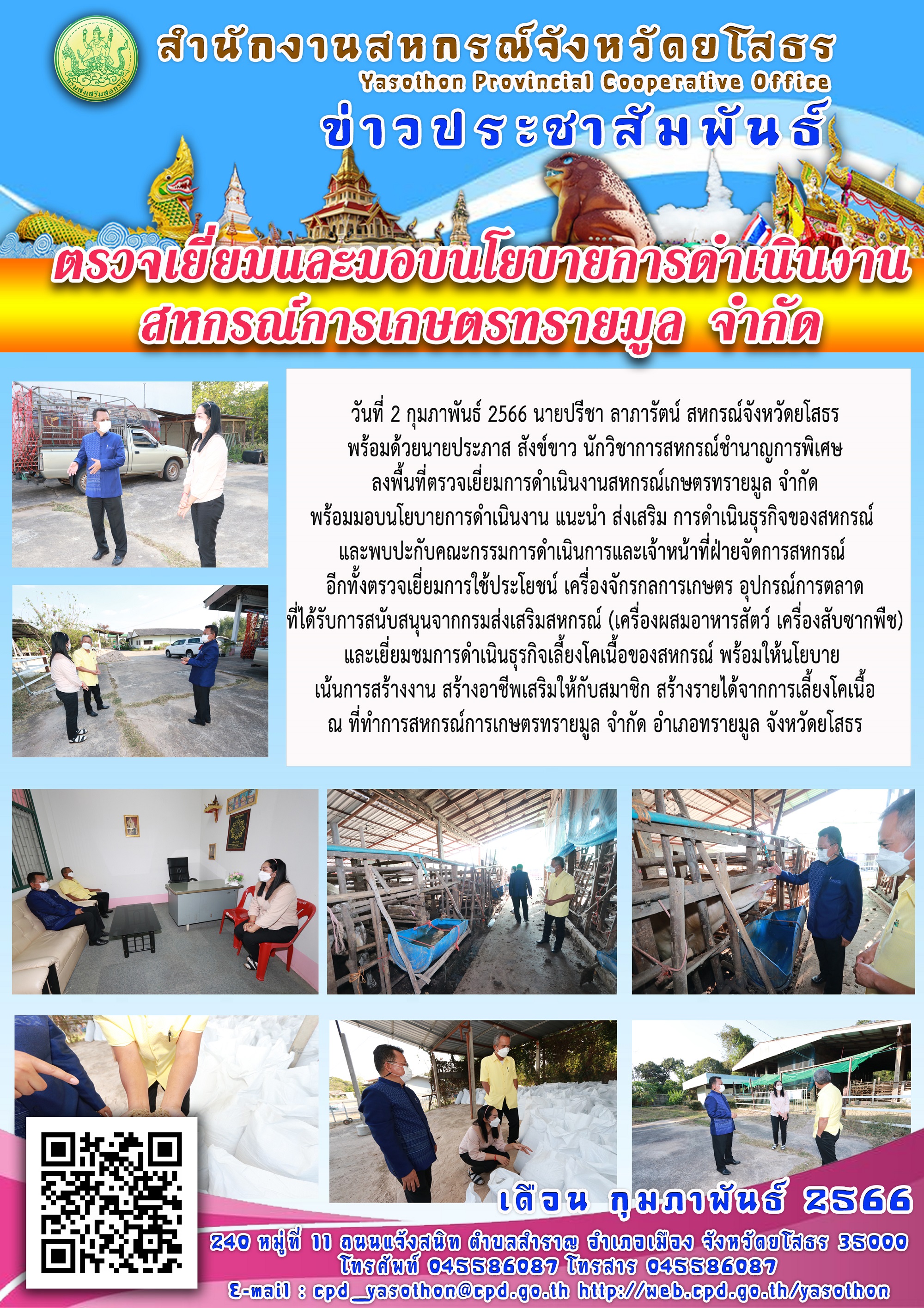 นายปรีชา ลาภารัตน์ สหกรณ์จังหวัดยโสธร พร้อมด้วยนายประภาส สังข์ขาว นักวิชาการสหกรณ์ชำนาญการพิเศษ ลงพื้นที่ตรวจเยี่ยมการดำเนินงานสหกรณ์เกษตรทรายมูล จำกัด พร้อมมอบนโยบายการดำเนินงาน แนะนำ ส่งเสริม การดำเนินธุรกิจของสหกรณ์ และพบปะกับคณะกรรมการดำเนินการ