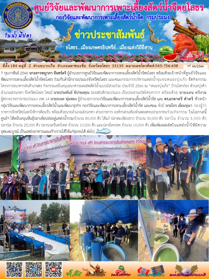 ผอ.ศพจ.ยโสธร พร้อมด้วยเจ้าหน้าที่ศพจ.ยโสธร ร่วมกับสนง.ปจ.ยโสธร และคณะกรรมการบริหารแหล่งน้ำชุมชนหนองบุ่งเก้ง จัดกิจกรรมโครงการธนาคารสินค้าเกษตร กิจกรรมสนับสนุนธนาคารผลผลิตสัตว์น้ำแบบมีส่วนร่วม ประจำปี 2566 ณ “หนองบุ่งเก้ง”