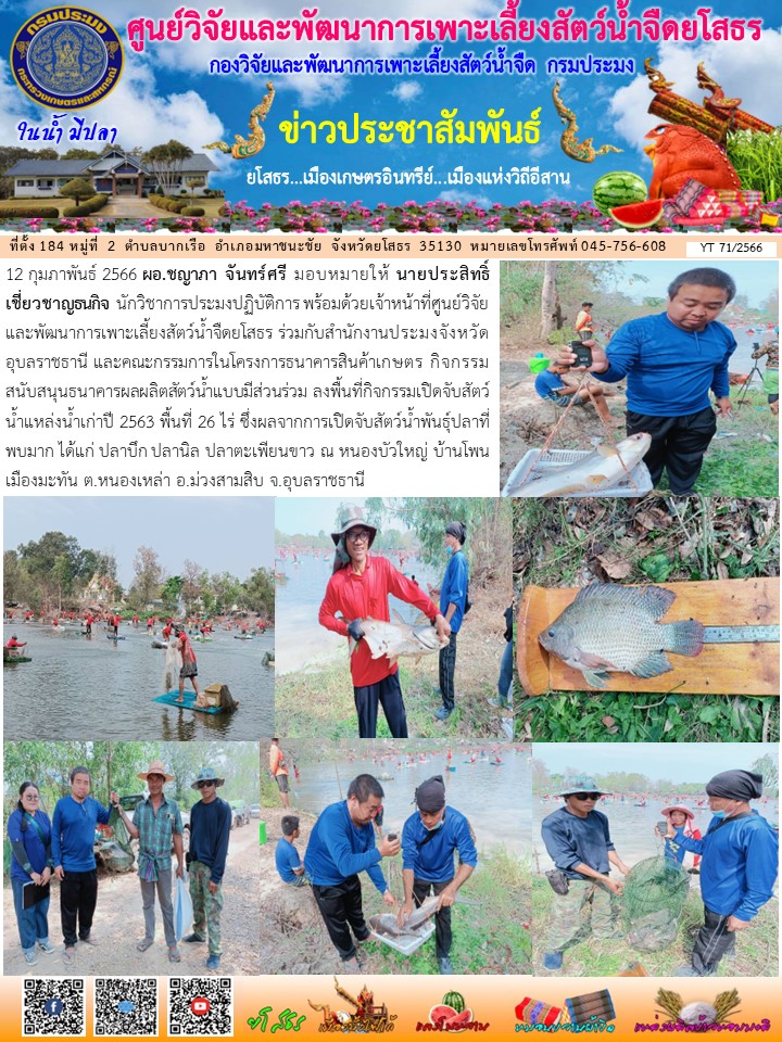 คณะเจ้าหน้าที่ศูนย์วิจัยและพัฒนาการเพาะเลี้ยงสัตว์น้ำจืดยโสธร ร่วมกับสำนักงานประมงจังหวัดอุบลราชธานี และคณะกรรมการในโครงการธนาคารสินค้าเกษตร ลงพื้นที่กิจกรรมเปิดจับสัตว์น้ำแหล่งน้ำเก่าปี 2563