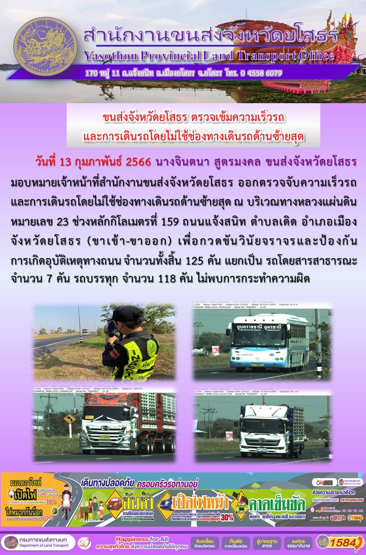 วันที่ 13 กุมภาพันธ์ 2566 เจ้าหน้าที่สำนักงานขนส่งจังหวัดยโสธร ออกตั้งจุดตรวจจับความเร็ว