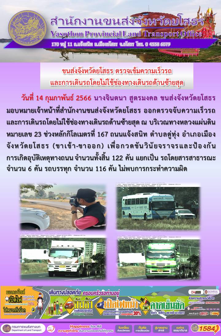 วันที่ 14 กุมภาพันธ์ 2566 เจ้าหน้าที่สำนักงานขนส่งจังหวัดยโสธร ออกตั้งจุดตรวจจับความเร็ว