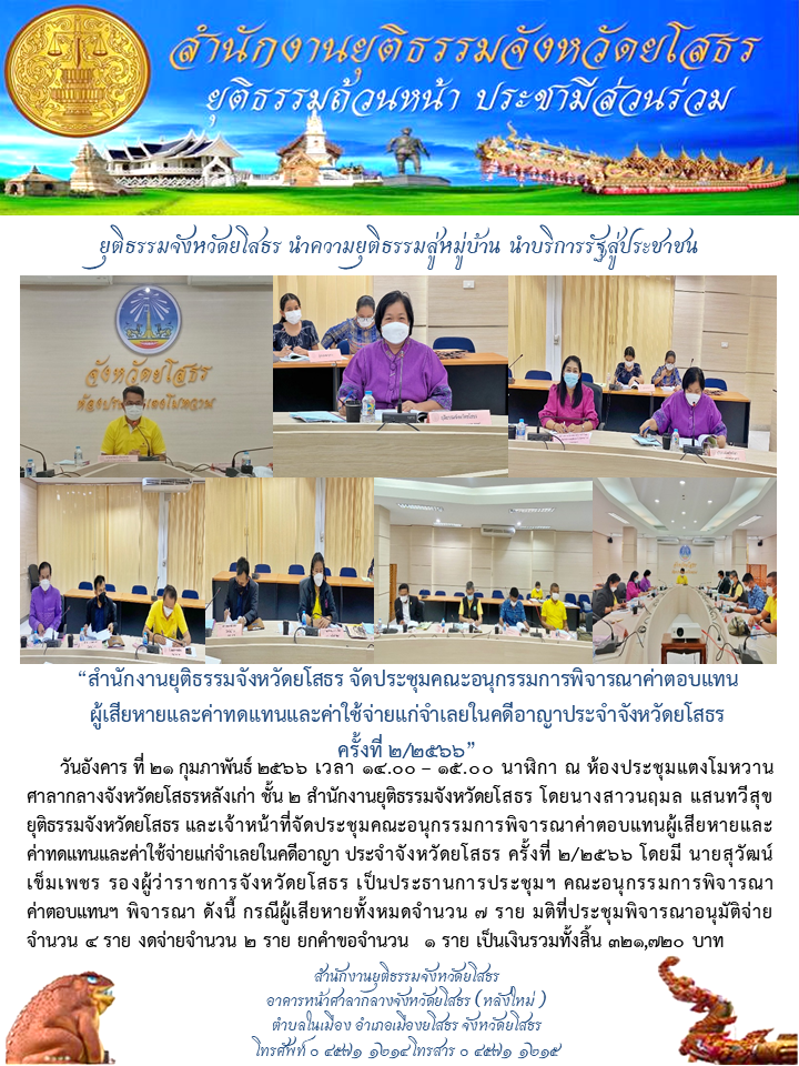 วันที่ 21 ก.พ. 2566 (16:44 น.)วันอังคาร ที่ 21 กุมภาพันธ์ 2566 เวลา 14.00 – 15.00 นาฬิกา ณ ห้องประชุมแตงโมหวาน ศาลากลางจังหวัดยโสธรหลังเก่า ชั้น 2 สำนักงานยุติธรรมจังหวัดยโสธร โดยนางสาวนฤมล แสนทวีสุข ยุติธรรมจังหวัดยโสธร และเจ้าหน้าที่จัดประชุมคณะอนุกรรมการพิจารณาค่าตอบแทนผู้เสียหายและค่าทดแทนและค่าใช้จ่ายแก่จำเลยในคดีอาญา ประจำจังหวัดยโสธร ครั้งที่ 2/2566 โดยมี นายสุวัฒน์ เข็มเพชร รองผู้ว่าราชการจังหวัดยโสธร เป็นประธานการประชุมฯ คณะอนุกรรมการพิจารณาค่าตอบแทนฯ พิจารณา ดังนี้ กรณีผู้เสียหายทั้งหมดจำนวน 7 ราย มติที่ประชุมพิจารณาอนุมัติจ่ายจำนวน 4 ราย งดจ่ายจำนวน 2 ราย ยกคำขอจำนวน 1 ราย เป็นเงินรวมทั้งสิ้น 321,720 บาท