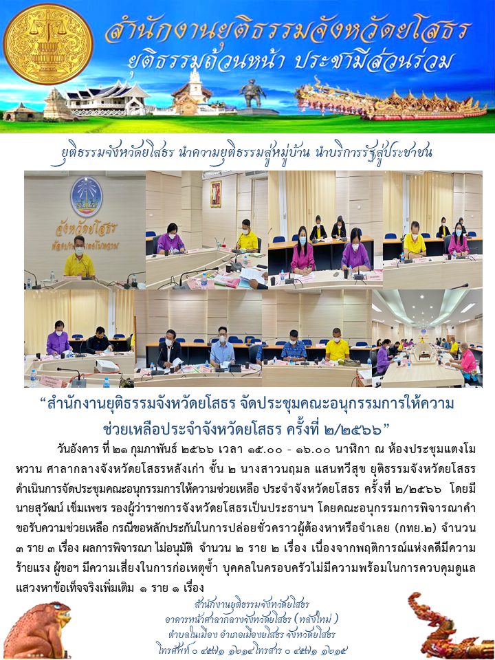 สำนักงานยุติธรรมจังหวัดยโสธร จัดประชุมคณะอนุกรรมการให้ความช่วยเหลือประจำจังหวัดยโสธร ครั้งที่ 2/2566