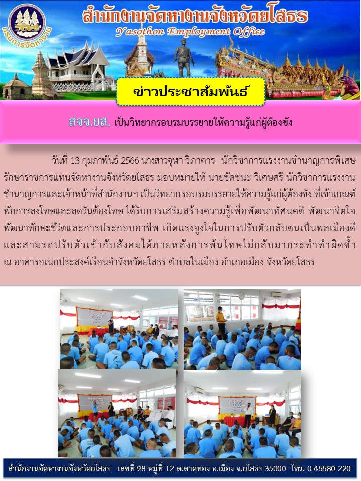 วันที่ 22 ก.พ. 2566 (10:17 น.)สจจ.ยโสธร เป็นวิทยากรอบรมบรรยายแก่ผู้ต้องขัง