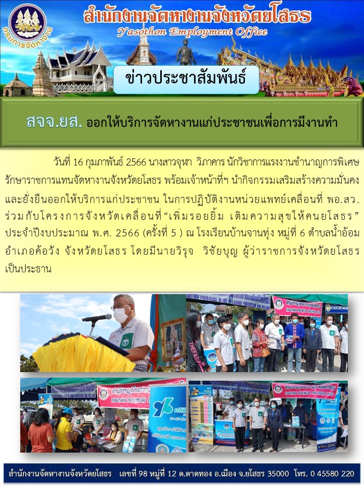 วันที่ 22 ก.พ. 2566 (10:30 น.)สจจ.ยโสธรออกให้บริการจัดหางานแก่ประชาชนเพื่อการมีงานทำ