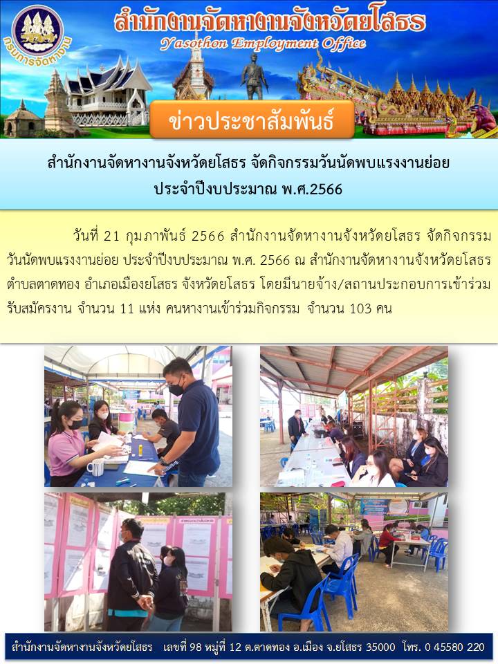 วันที่ 22 ก.พ. 2566 (10:34 น.)สำนักงานจัดหางานจังหวัดยโสธร จัดกิจกรรมวันนัดพบแรงงานย่อย ประจำปีงบประมาณ พ.ศ. 2566