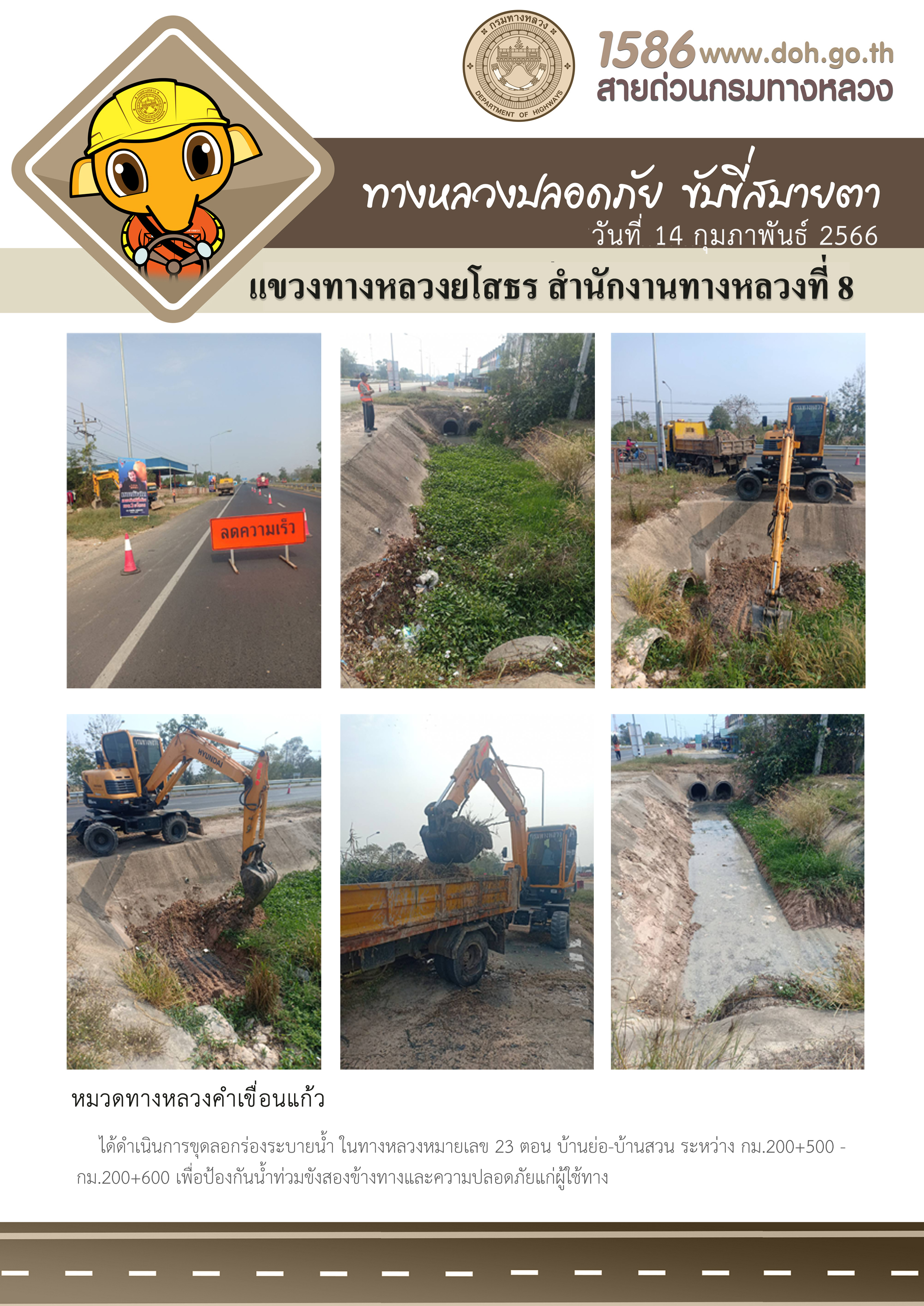 วันที่ 14 กุมภาพันธ์ 2566 หมวดทางหลวงคำเขื่อนแก้ว ได้ดำเนินการขุดลอกร่องระบายน้ำ ในทางหลวงหมายเลข 23 ตอน บ้านย่อ-บ้านสวน ระหว่าง กม.200+500 - กม.200+600 เพื่อป้องกันน้ำท่วมขังสองข้างทางและความปลอดภัยแก่ผู้ใช้ทาง