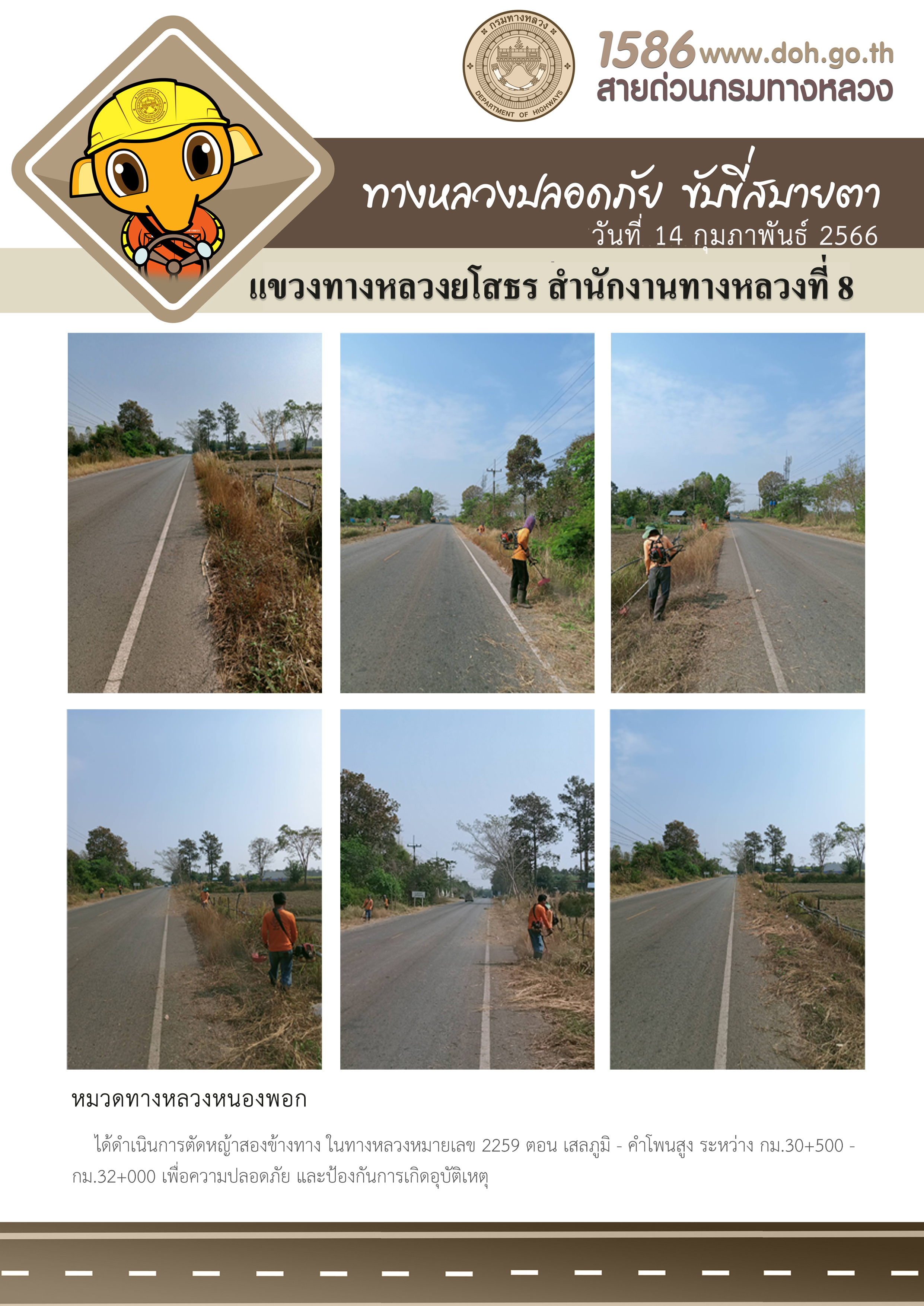 วันที่ 14 กุมภาพันธ์ 2566 หมวดทางหลวงหนองพอก ได้ดำเนินการตัดหญ้าสองข้างทาง ในทางหลวงหมายเลข 2259 ตอน เสลภูมิ - คำโพนสูง ระหว่าง กม.30+500 - กม.32+000 เพื่อความปลอดภัย และป้องกันการเกิดอุบัติเหตุ