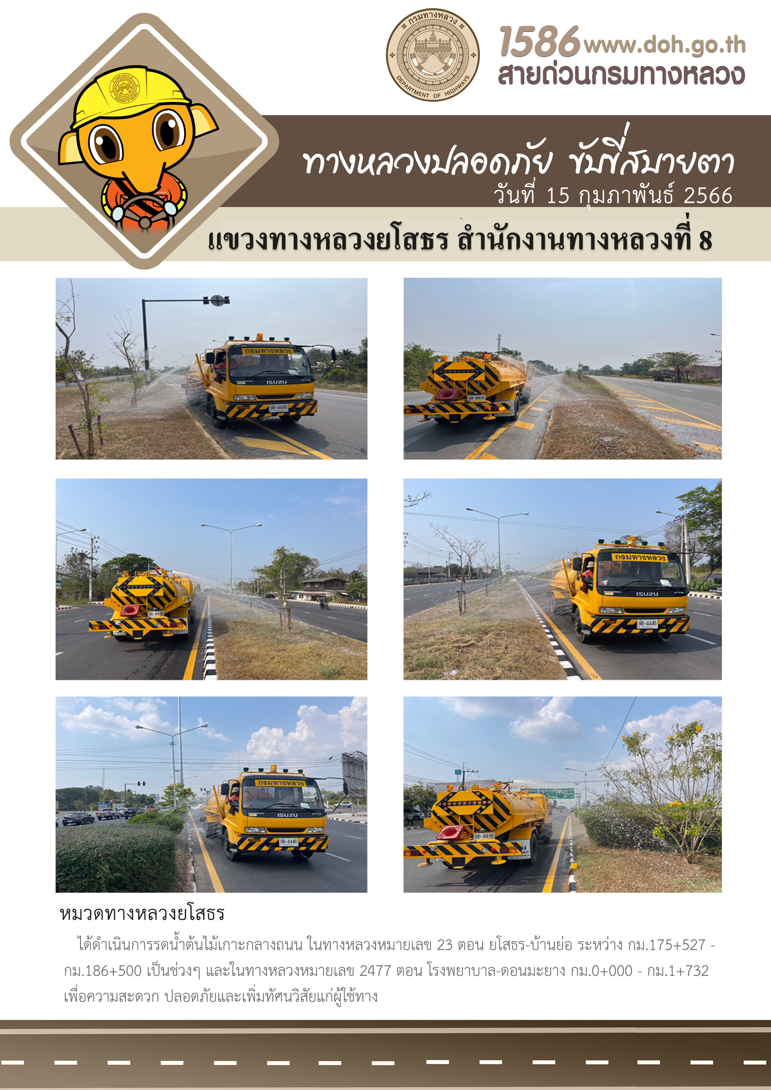 วันที่ 15 กุมภาพันธ์ 2566 หมวดทางหลวงยโสธร ได้ดำเนินการรดน้ำต้นไม้เกาะกลางถนน ในทางหลวงหมายเลข 23 ตอน ยโสธร-บ้านย่อ ระหว่าง กม.175+527 - กม. 186+500 เป็นช่วงๆ และในทางหลวงหมายเลข 2477 ตอน โรงพยาบาล-ดอนมะยาง กม.0+000 - กม.1+732 เพื่อความสะดวก ปลอดภัยแ