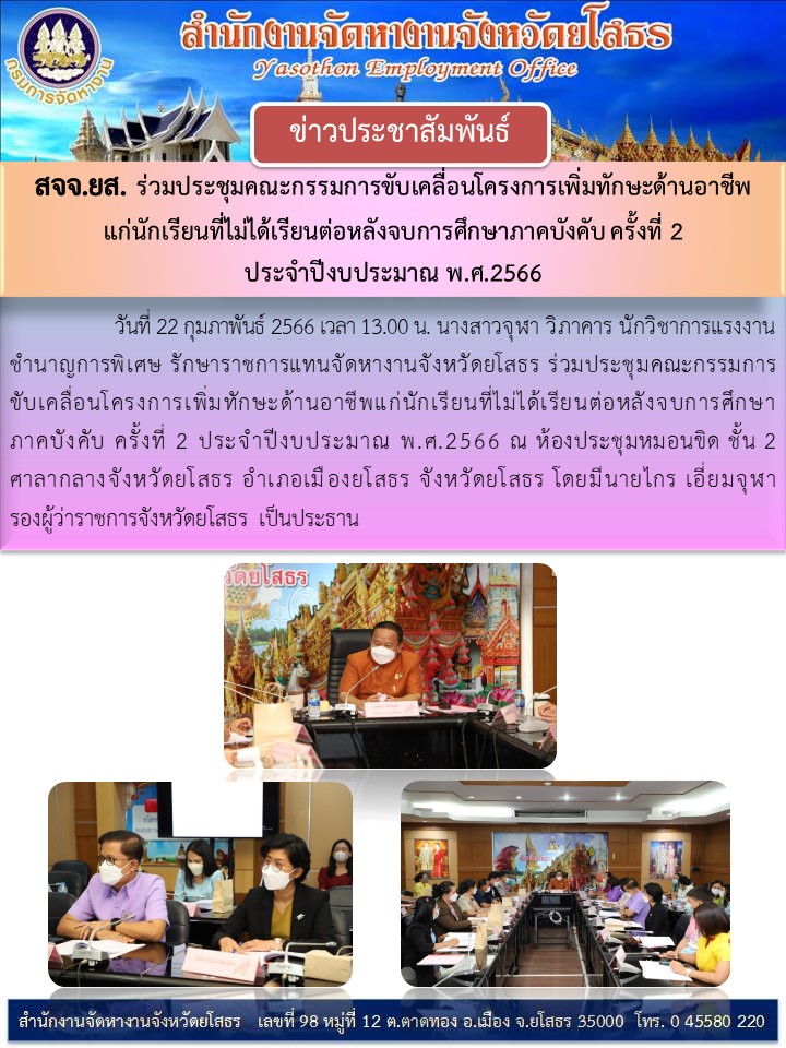 สจจ.ยโสธร ร่วมประชุมคณะกรรมการขับเคลื่อนโครงการเพิ่มทักษะอาชีพแก่นักเรียนที่ไม่ได้เรียนต่อหลังจบการศึกษาภาคบังคับครั้งที่ 2 ประจำปีงบประมาณ พ.ศ. 2566