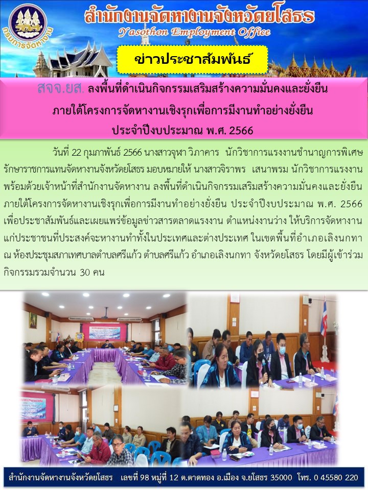สจจ.ยโสธร ลงพื้นที่ดำเนินกิจกรรมเสริมสร้างความมั่นคงและยั่งยืนภายใต้โครงการจัดหางานเชิงรุกเพื่อการมีงานทำอย่างยั่งยืนประจำปีงบประมาณ พ.ศ. 2566