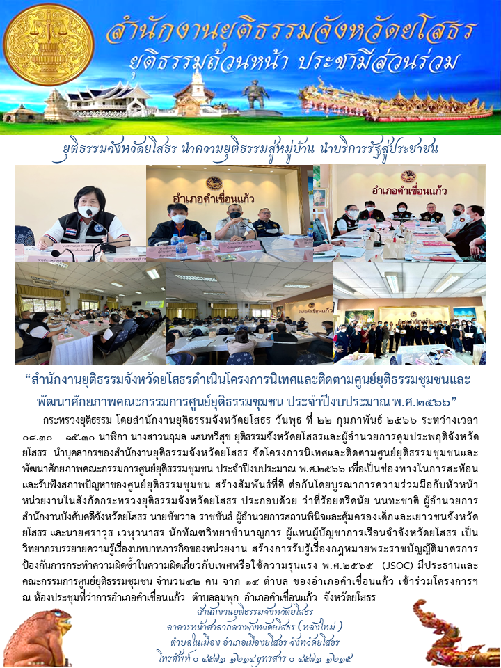 วันที่ 22 กุมภาพันธ์ 2566 สำนักงานยุติธรรมจังหวัดยโสธรดำเนินโครงการนิเทศและติดตามศูนย์ยุติธรรมชุมชนและพัฒนาศักยภาพคณะกรรมการศูนย์ยุติธรรมชุมชน ประจำปีงบประมาณ พ.ศ.2566