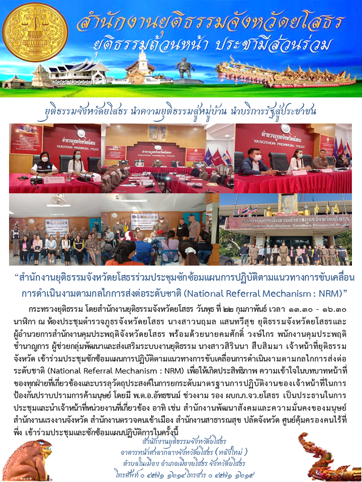 สำนักงานยุติธรรมจังหวัดยโสธรร่วมประชุมซักซ้อมแผนการปฏิบัติตามแนวทางการขับเคลื่อนการดำเนินงามตามกลไกการส่งต่อระดับชาติ (National Referral Mechanism : NRM)