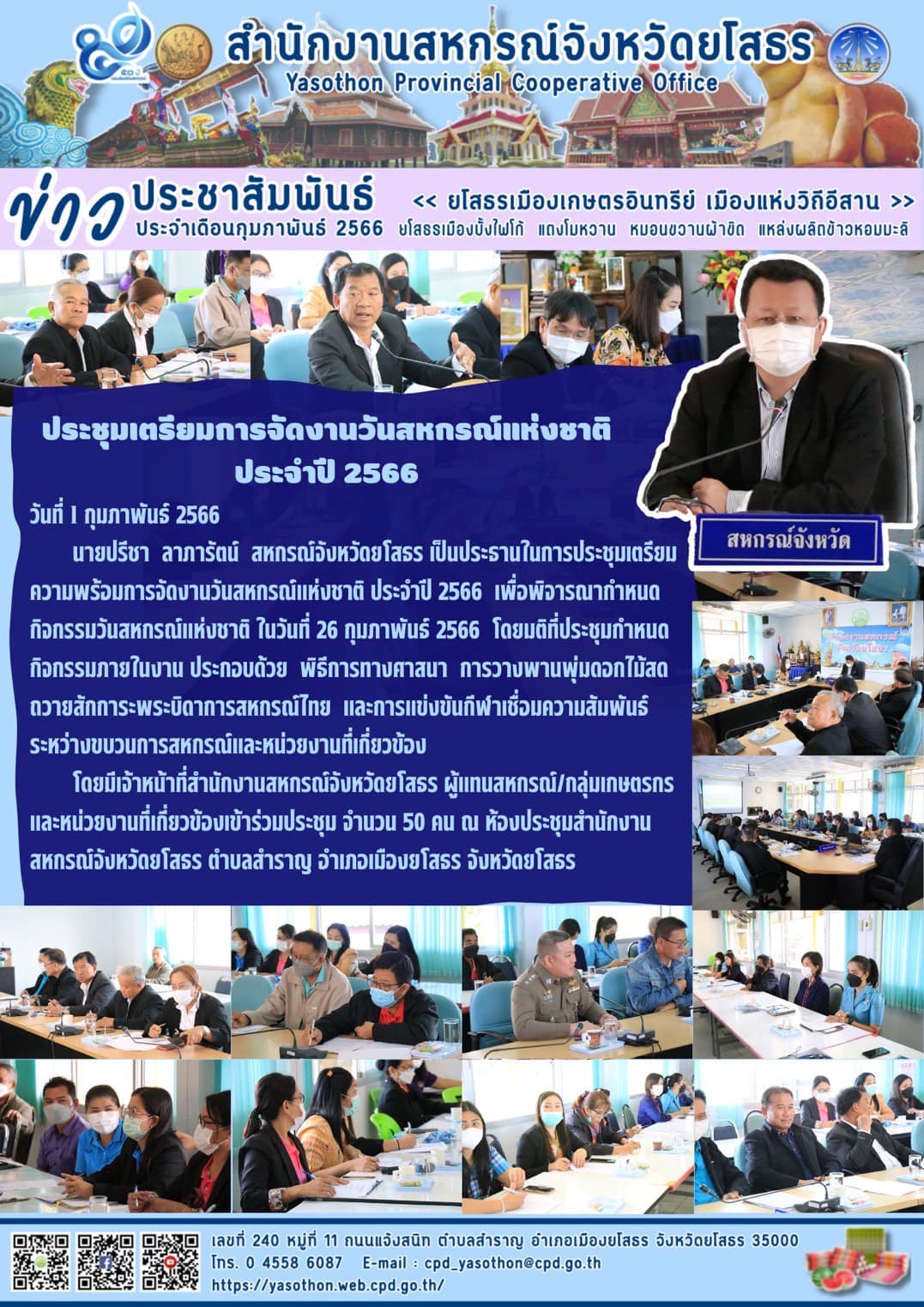 นายปรีชา ลาภารัตน์ สหกรณ์จังหวัดยโสธร เป็นประธานในการประชุมเตรียมความพร้อมการจัดงานวันสหกรณ์แห่งชาติ ประจำปี 2566 เพื่อพิจารณากำหนดกิจกรรมวันสหกรณ์แห่งชาติ ในวันที่ 26 กุมภาพันธ์ 2566 ณ ห้องประชุมสำนักงานสหกรณ์จังหวัดยโสธร