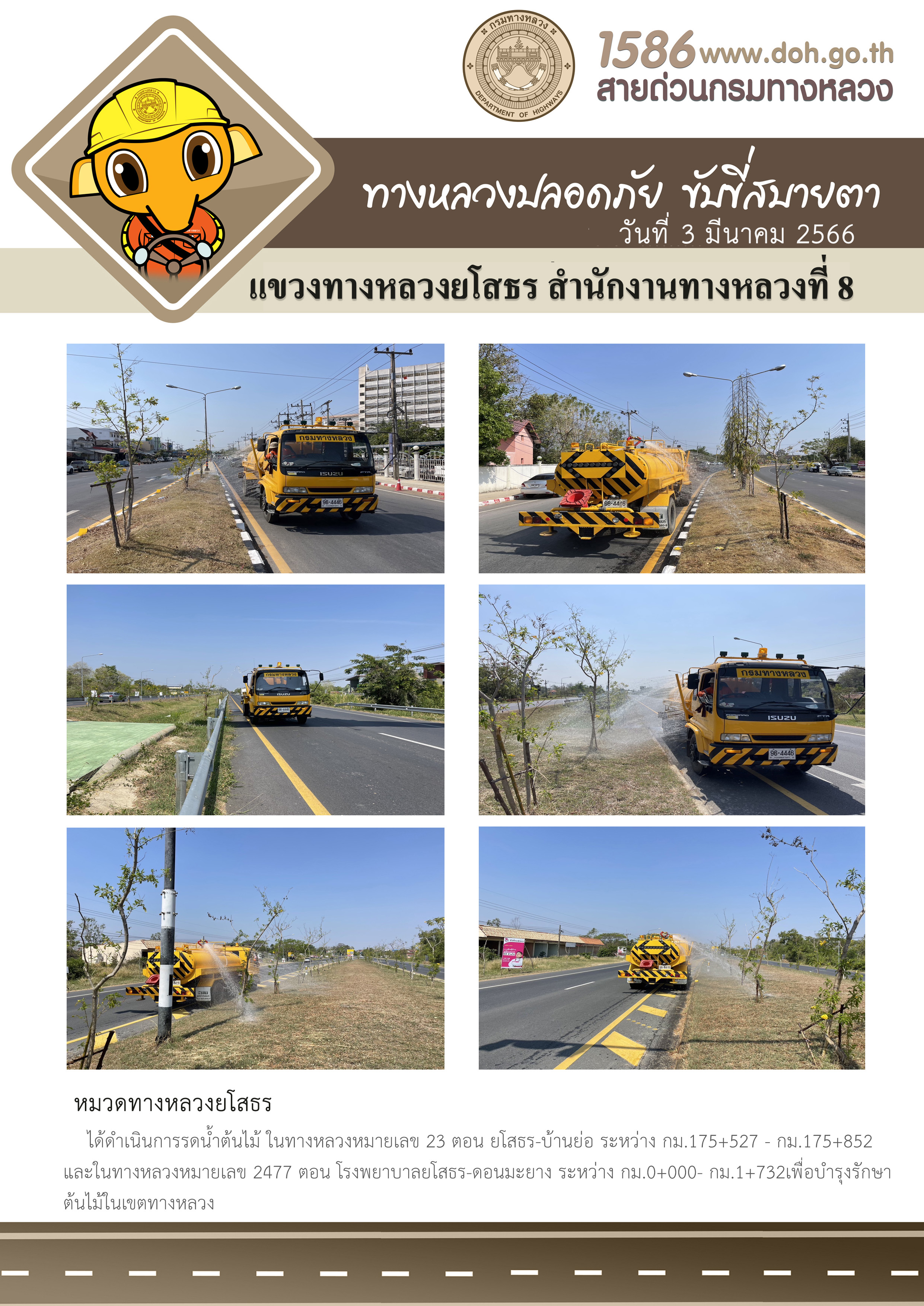 วันที่ 3 มีนาคม 2566 หมวดทางหลวงยโสธร ได้ดำเนินการรดน้ำต้นไม้ ใน ทล.หมายเลข 23 ตอน ยโสธร-บ้านย่อระหว่าง กม.175+527 - กม.175+852 และ ทล.หมายเลข 2477 ตอน รพ.ยโสธร-ดอนมะยาง ระหว่าง กม.0+000-กม.1+732เพื่อบำรุงรักษาต้นไม้ในเขตทางหลวง