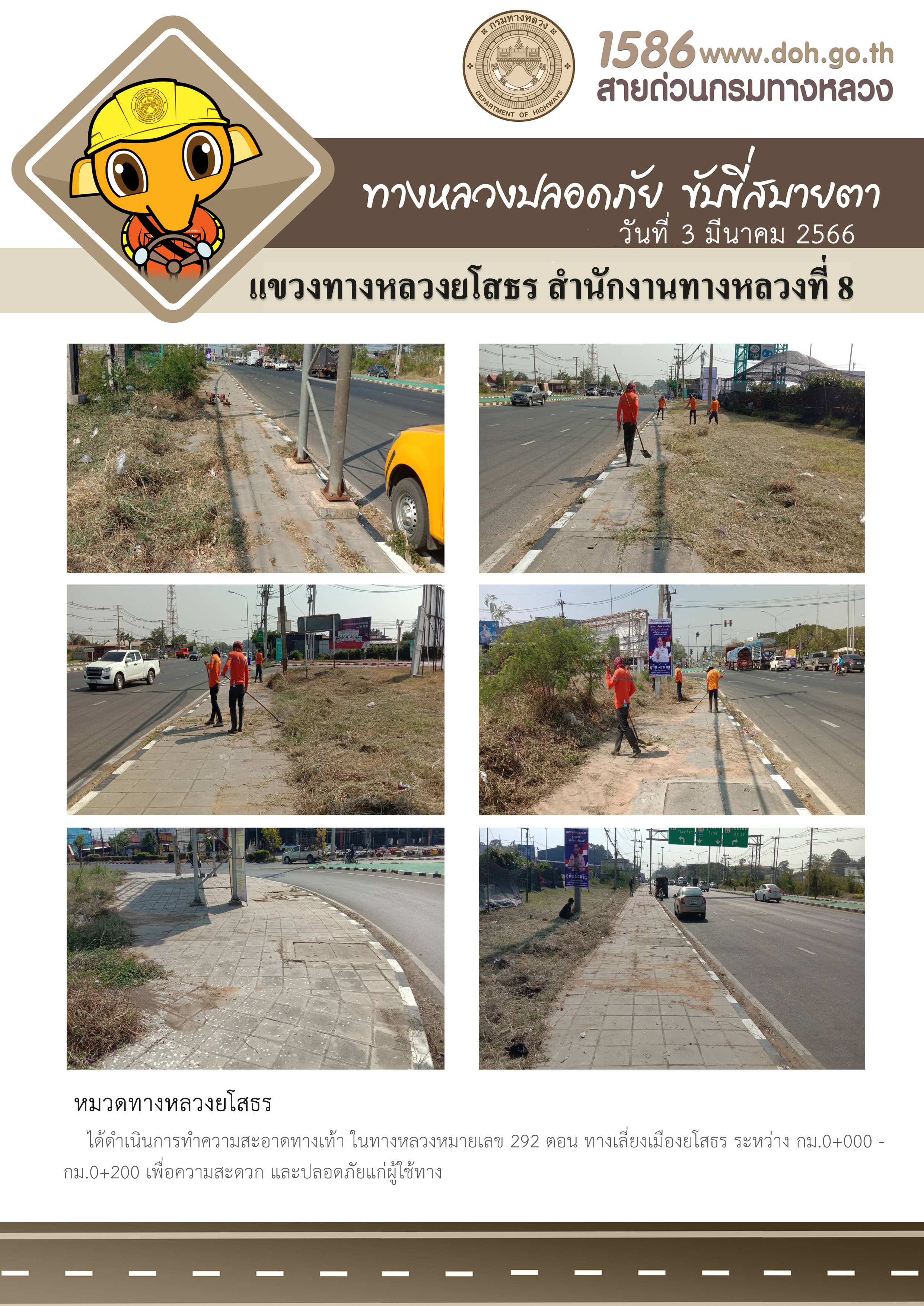 วันที่ 3 มีนาคม 2566 หมวดทางหลวงยโสธร ได้ดำเนินการทำความสะอาดทางเท้า ในทางหลวงหมายเลข 292 ตอนทางเลี่ยงเมืองยโสธร ระหว่าง กม.0+000 - กม.0+200 เพื่อความสะดวก และปลอดภัยแก่ผู้ใช้ทาง