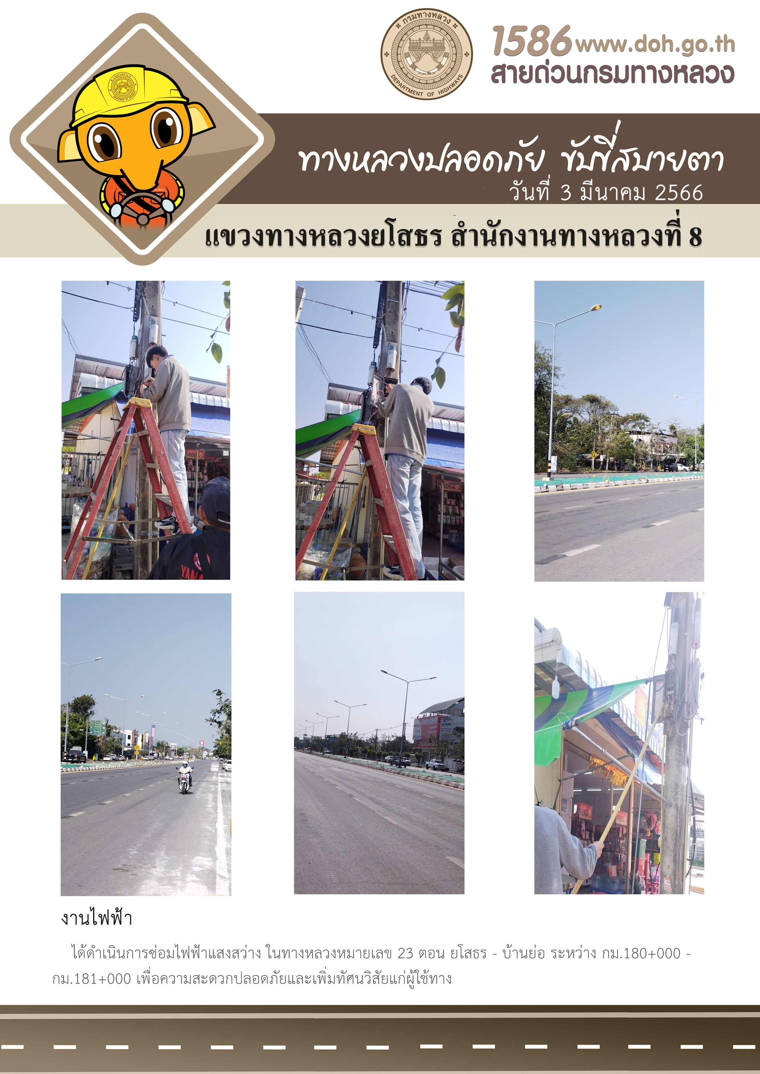วันที่ 3 มีนาคม 2566 งานไฟฟ้า ได้ดำเนินการซ่อมไฟฟ้าแสงสว่าง ในทางหลวงหมายเลข 23 ตอน ยโสธร - บ้านย่อ ระหว่าง กม.180+000 - กม.181+000 เพื่อความสะดวกปลอดภัยและเพิ่มทัศนวิสัยแก่ผู้ใช้ทาง