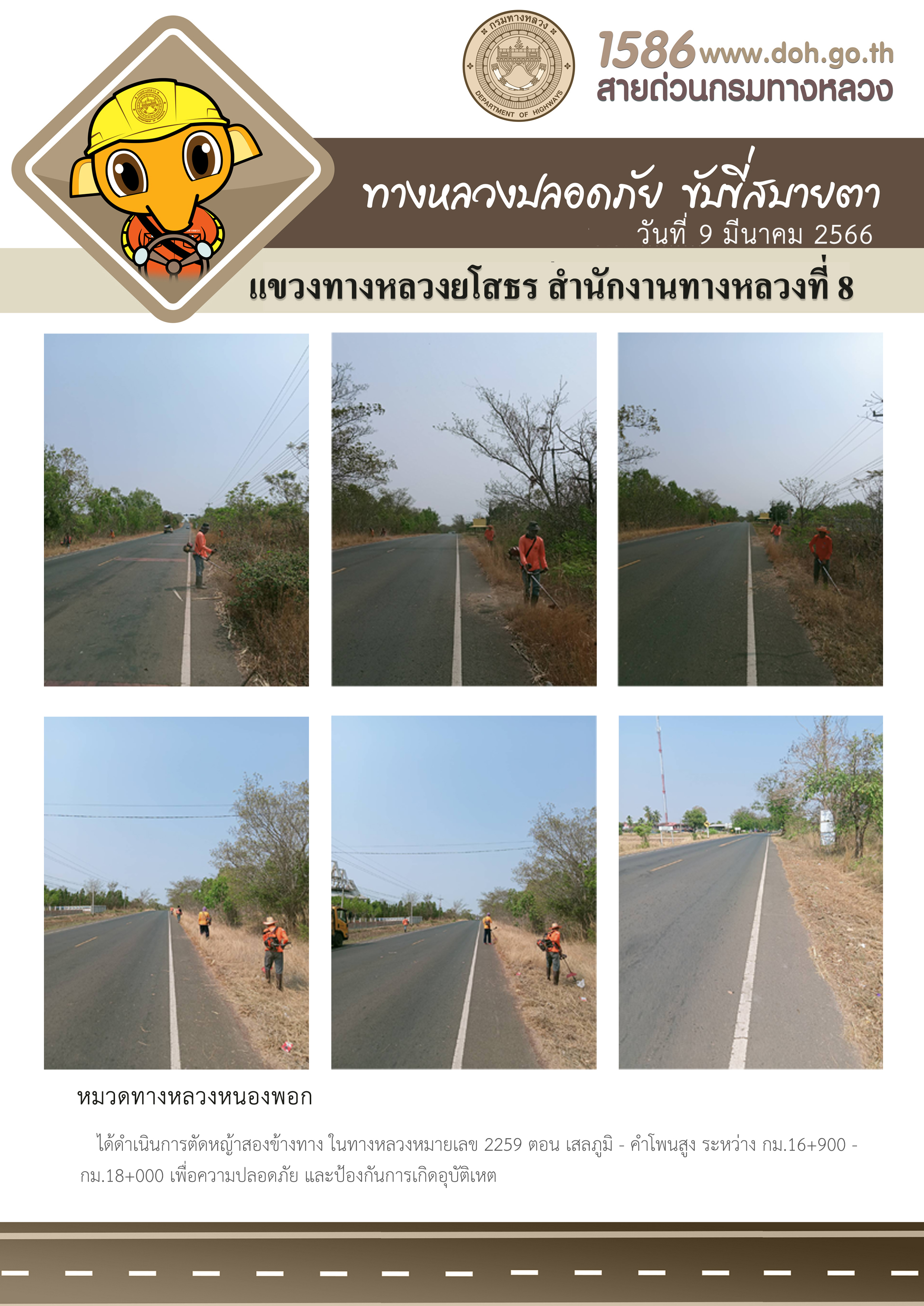 วันที่ 9 มีนาคม 2566 หมวดทางหลวงหนองพอก ได้ดำเนินการตัดหญ้าสองข้างทาง ในทางหลวงหมายเลข 2259 ตอน เสลภูมิ - คำโพนสูง ระหว่าง กม.16+900 - กม.18+000 เพื่อความปลอดภัย และป้องกันการเกิดอุบัติเหตุ