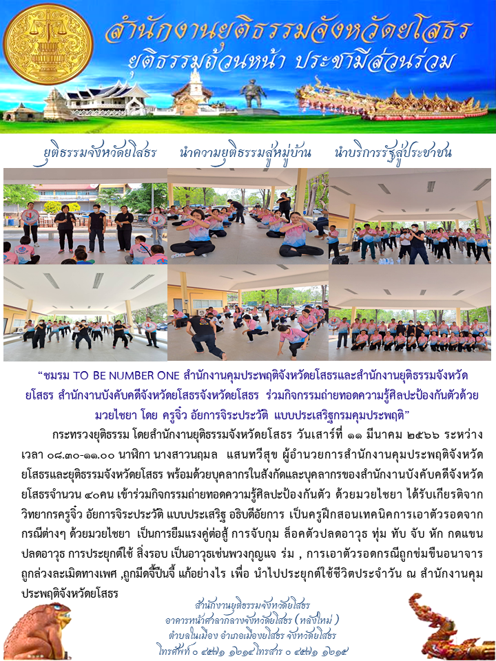 ชมรม TO BE NUMBER ONE สำนักงานคุมประพฤติจังหวัดยโสธรและสำนักงานยุติธรรมจังหวัดยโสธร สำนักงานบังคับคดีจังหวัดยโสธรจังหวัดยโสธร ร่วมกิจกรรมถ่ายทอดความรู้ศิลปะป้องกันตัวด้วยมวยไชยา โดย ครูจิ๋ว อัยการจิระประวัติ แบบประเสริฐกรมคุมประพฤติ