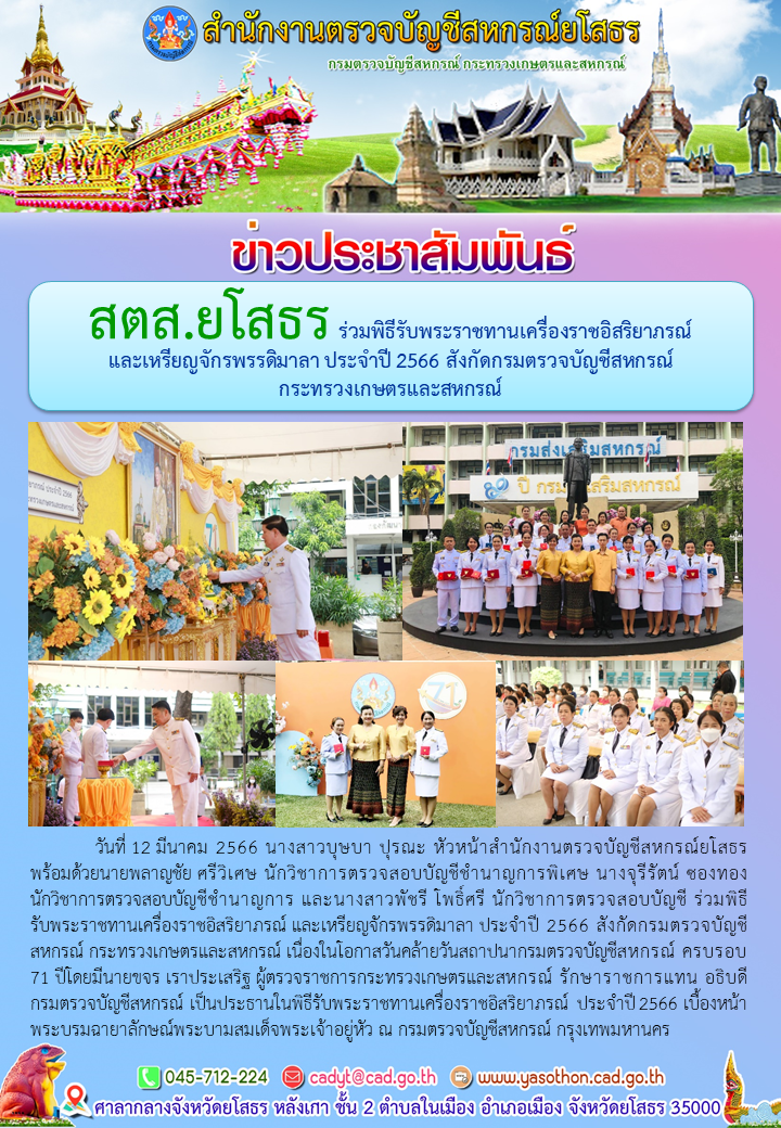 สตส.ยโสธร ร่วมพิธีรับพระราชทานเครื่องราชอิสริยาภรณ์ และเหรียญจักรพรรดิมาลา ประจำปี 2566 สังกัดกรมตรวจบัญชีสหกรณ์ กระทรวงเกษตรและสหกรณ์