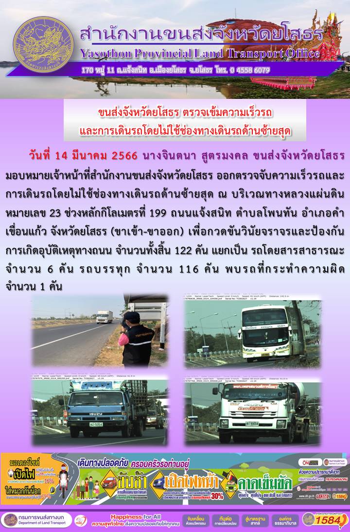 วันที่ 14 มีนาคม 2566 เจ้าหน้าที่สำนักงานขนส่งจังหวัดยโสธร ออกตั้งจุดตรวจจับความเร็ว