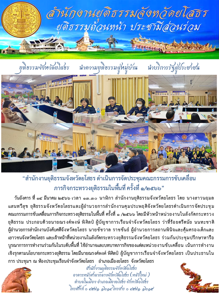 สำนักงานยุติธรรมจังหวัดยโสธร ดำเนินการจัดประชุมคณะกรรมการขับเคลื่อนภารกิจกระทรวงยุติธรรมในพื้นที่ ครั้งที่ 1/2566