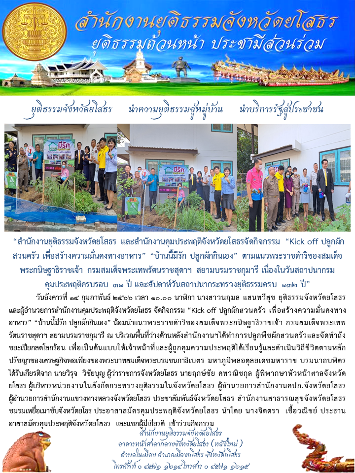 สำนักงานยุติธรรมจังหวัดยโสธร และสำนักงานคุมประพฤติจังหวัดยโสธรจัดกิจกรรม “Kick off ปลูกผักสวนครัว เพื่อสร้างความมั่นคงทางอาหาร” “บ้านนี้มีรัก ปลูกผักกินเอง” ตามแนวพระราชดำริของสมเด็จพระกนิษฐาธิราชเจ้า กรมสมเด็จพระเทพรัตนราชสุดาฯ สยามบรมราชกุมารี เนื่