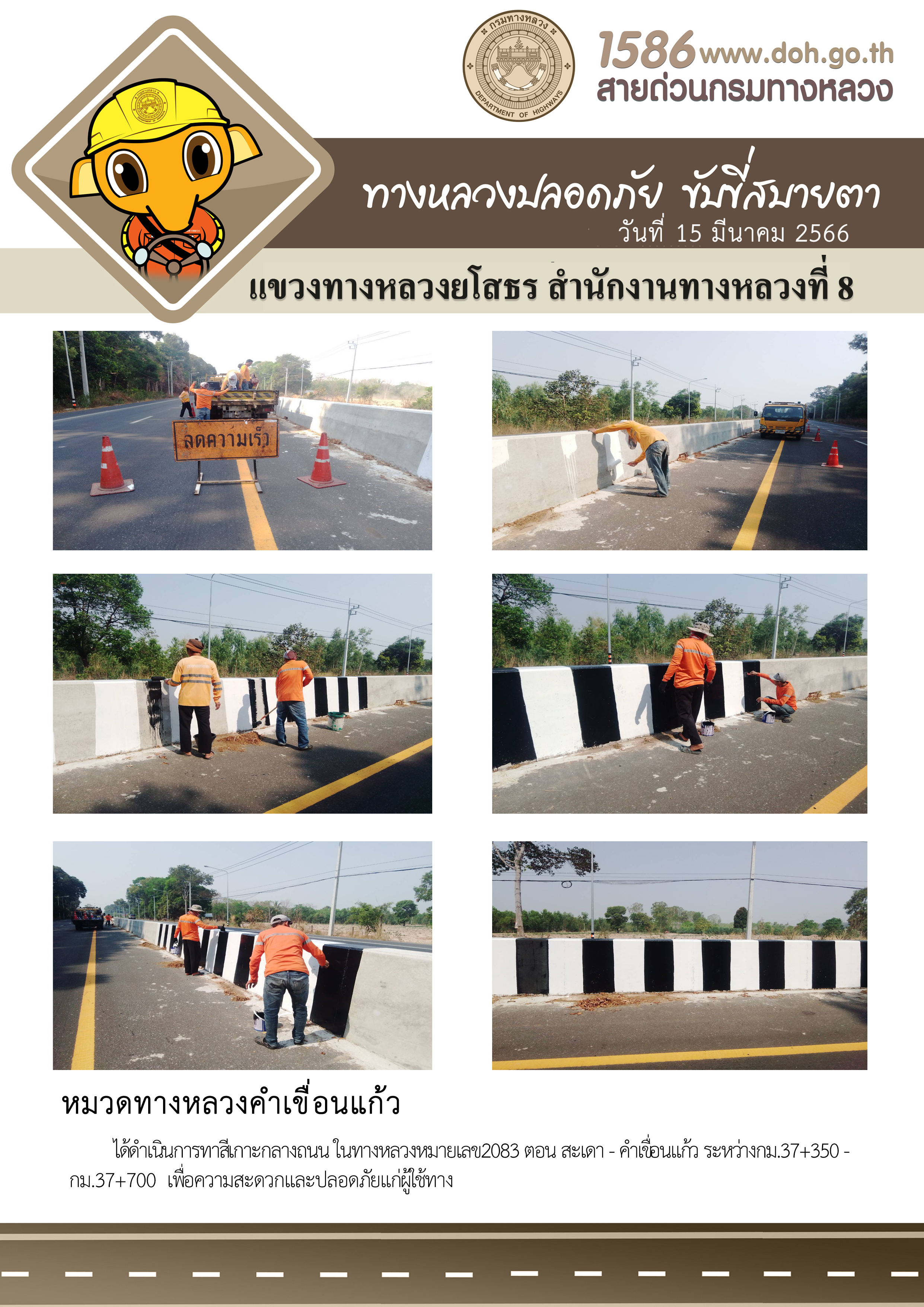 วันที่ 15 มีนาคม 2566 หมวดทางหลวงคำเขื่อนแก้ว ได้ดำเนินการทาสีเกาะกลางถนน ในทางหลวงหมายเลข2083 ตอน สะเดา - คำเขื่อนแก้ว ระหว่างกม.37+350 - กม.37+700 เพื่อความสะดวกและปลอดภัยแก่ผู้ใช้ทาง