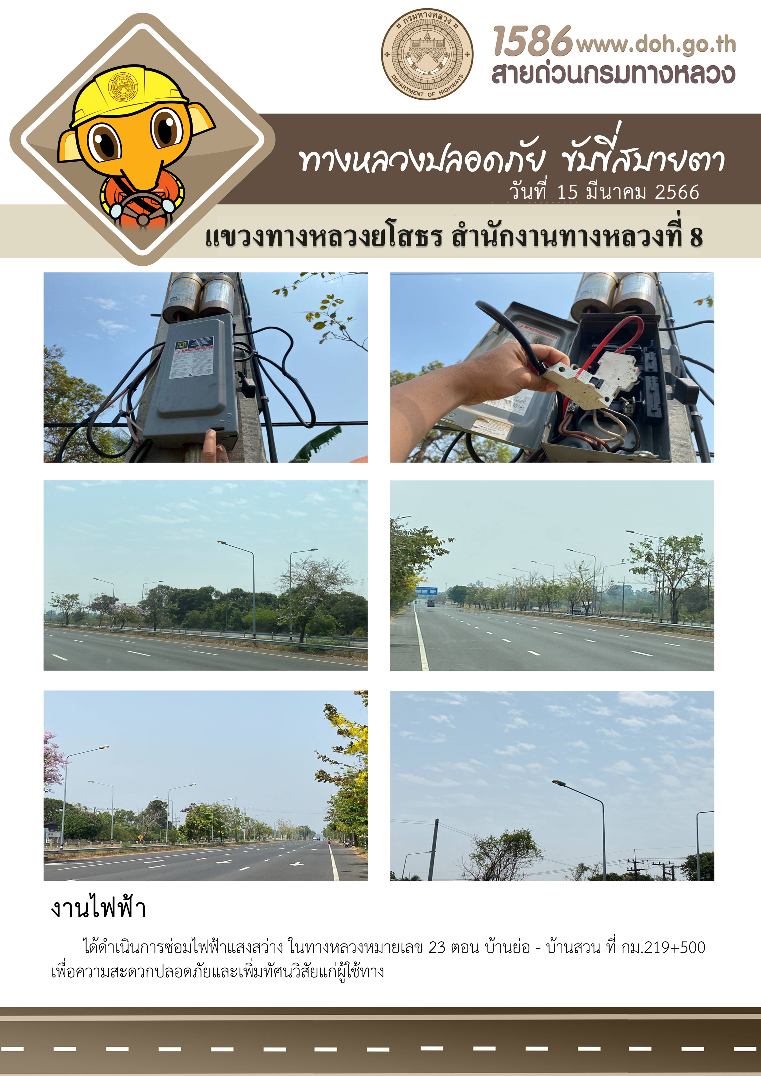 วันที่ 15 มีนาคม 2566 งานไฟฟ้า ได้ดำเนินการซ่อมไฟฟ้าแสงสว่าง ในทางหลวงหมายเลข 23 ตอน บ้านย่อ - บ้านสวน ที่ กม.219+500 เพื่อความสะดวกปลอดภัยและเพิ่มทัศนวิสัยแก่ผู้ใช้ทาง