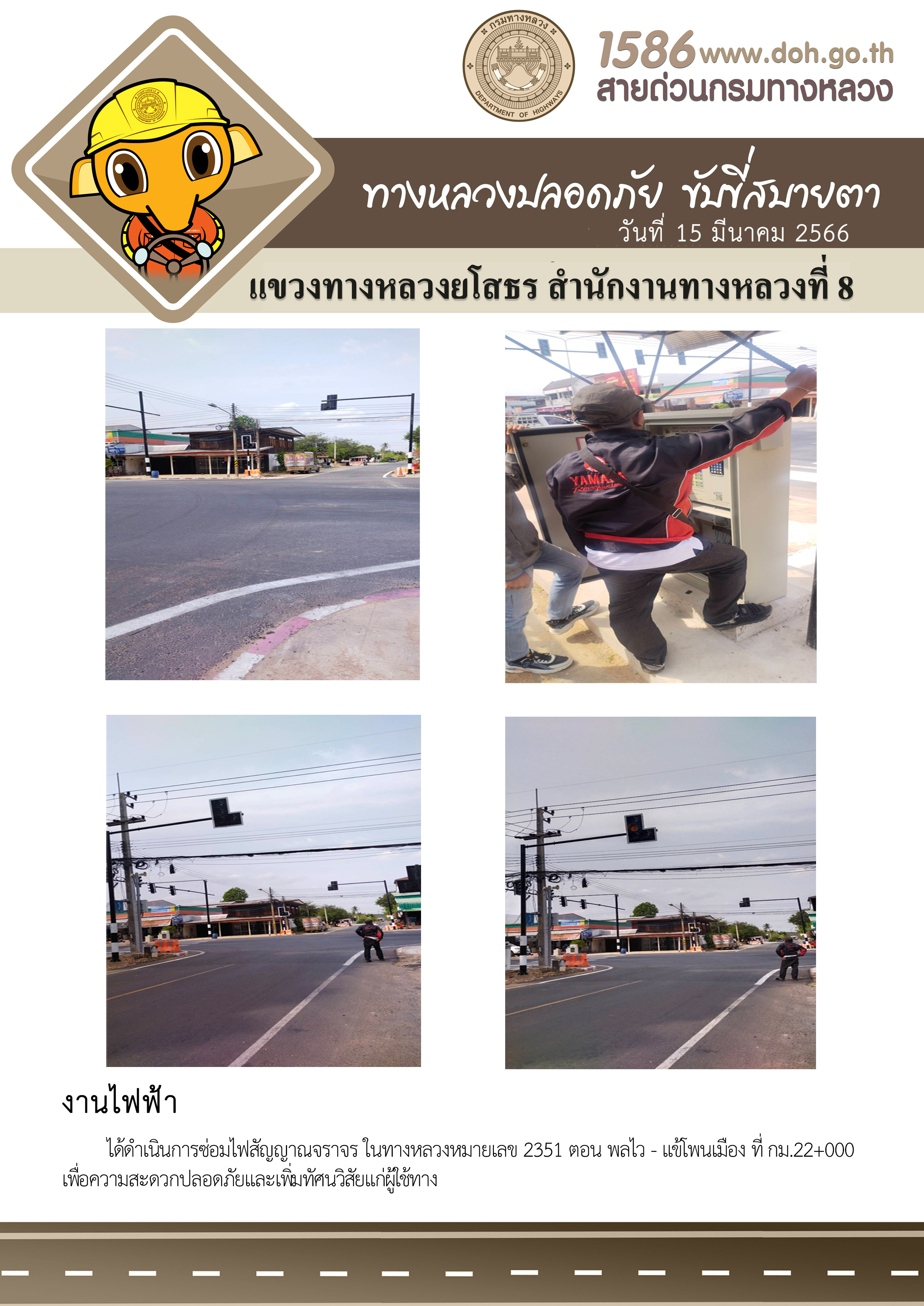 วันที่ 15 มีนาคม 2566 งานไฟฟ้า ได้ดำเนินการซ่อมไฟสัญญาณจราจร ในทางหลวงหมายเลข 2351 ตอน พลไว - แข้โพนเมือง ที่ กม.22+000 เพื่อความสะดวกปลอดภัยและเพิ่มทัศนวิสัยแก่ผู้ใช้ทาง