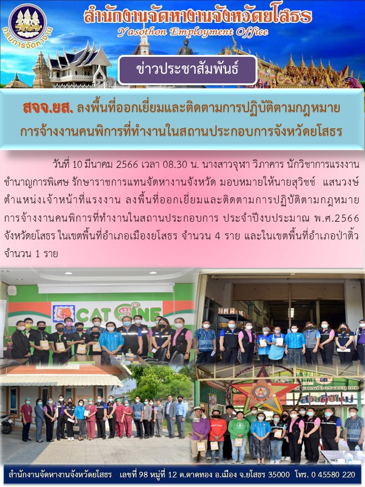 สจจ.ยส. ลงพื้นที่ออกเยี่ยมและติดตามการปฏิบัติตามกฏหมายการจ้างงานคนพิการที่ทำงานในสถานประกอบการจังหวัดยโสธร