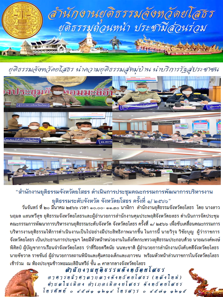 สำนักงานยุติธรรมจังหวัดยโสธร ดำเนินการประชุมคณะกรรมการพัฒนาการบริหารงานยุติธรรมระดับจังหวัด จังหวัดยโสธร ครั้งที่ 1/ 2566
