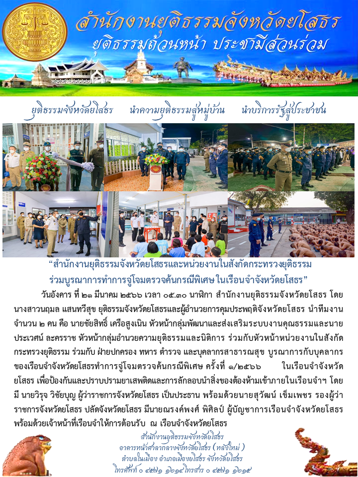 สำนักงานยุติธรรมจังหวัดยโสธรและหน่วยงานในสังกัดกระทรวงยุติธรรมร่วมบูรณาการทำการจู่โจมตรวจค้นกรณีพิเศษ ในเรือนจำจังหวัดยโสธร