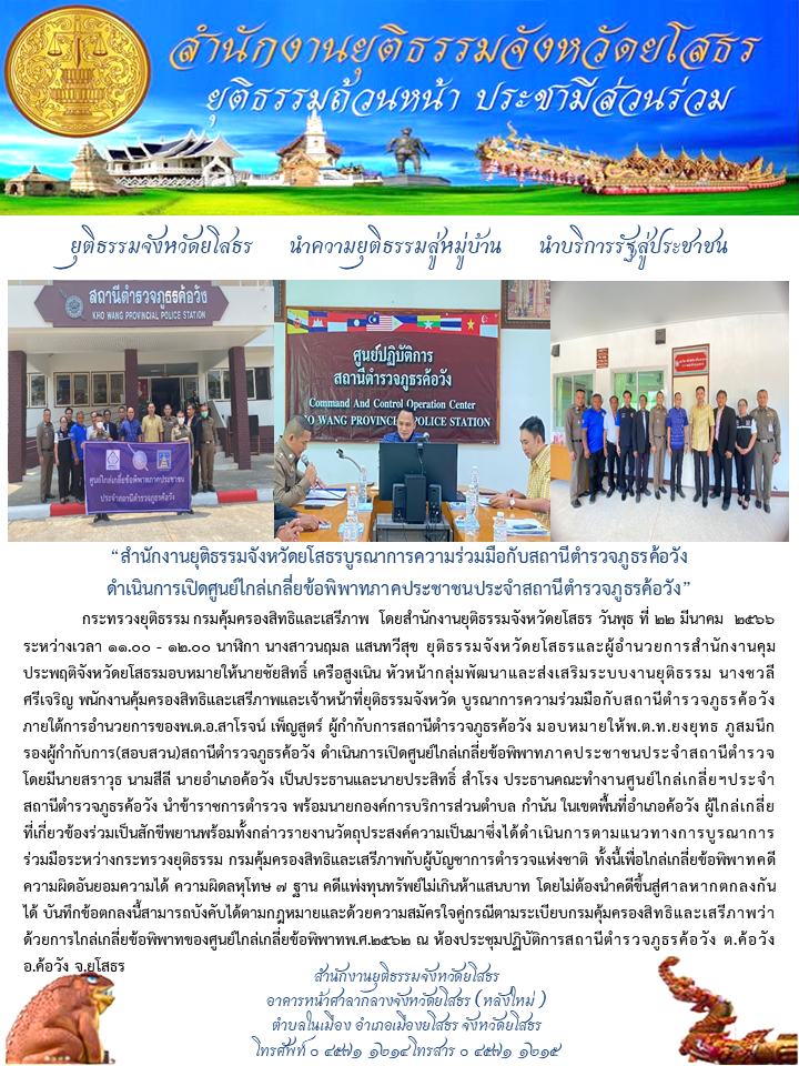 สำนักงานยุติธรรมจังหวัดยโสธรบูรณาการความร่วมมือกับสถานีตำรวจภูธรค้อวัง ดำเนินการเปิดศูนย์ไกล่เกลี่ยข้อพิพาทภาคประชาชนประจำสถานีตำรวจภูธรค้อวัง