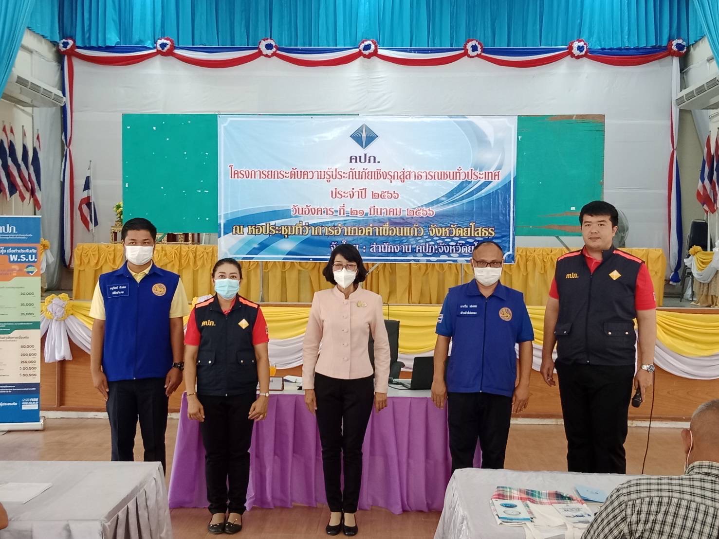 วันที่ 22 มี.ค. 2566 (17:37 น.)วันที่ 21 มีนาคม 2566 เวลา 9.30 น. นางยุพิน ภัทรกุลพงศ์ นายอำเภอคำเขื่อนแก้ว เป็นประธานในพิธีเปิดโครงการยกระดับความรู้ประกันภัยเชิงรุกสู่สาธารณชนทั่วประเทศ ประจำปี 2566 โดยมี นางอโนมา อินทรีย์ ผู้อำนวยการสำนักงานคณะกรรมการกำกับและส่งเสริมการประกอบธุรกิจประกันภัยจังหวัดยโสธร กล่าวรายงานวัตถุประสงค์ของโครงการ ณ หอประชุม 100 ปี อำเภอคำเขื่อนแก้ว ทั้งนี้ มีปลัดอำเภอ กำนัน ผู้ใหญ่บ้าน ผู้แทนองค์กรปกครองส่วนท้องถิ่น อาสาสมัครสาธารณสุขประจำหมู่บ้าน (อสม.) และผู้แทนหน่วยกู้ภัยในพื้นที่อำเภอคำเขื่อนแก้วเข้าร่วมโครงการ จำนวน 50 คน