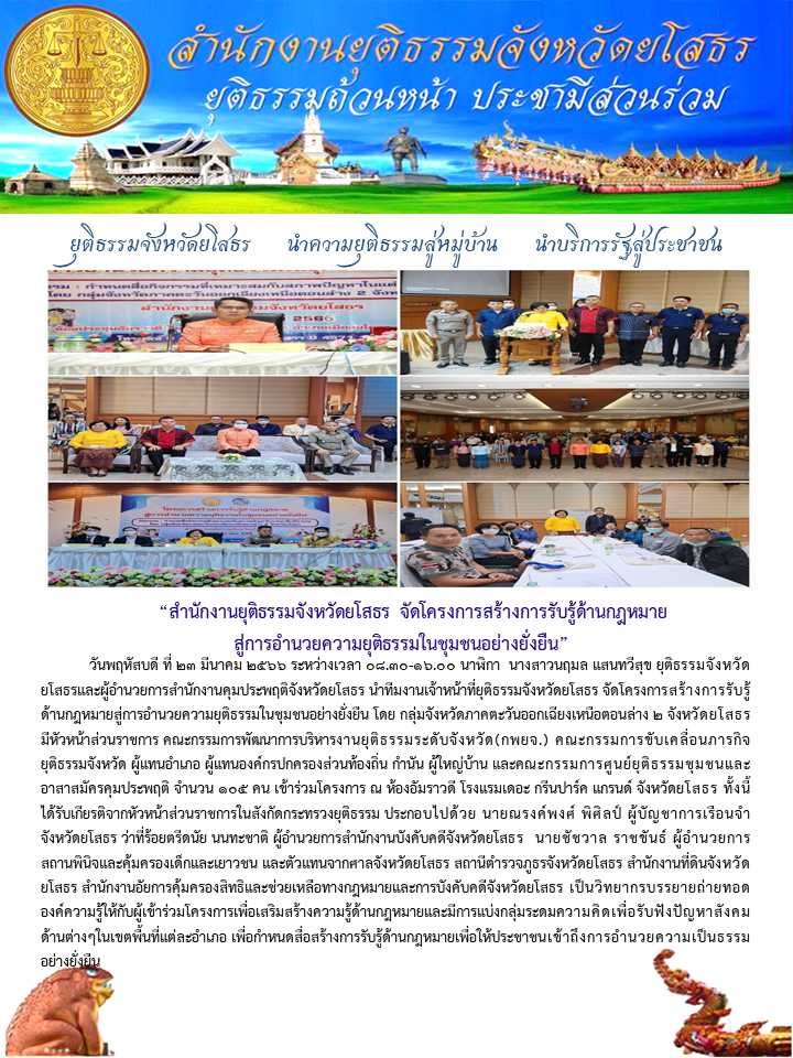สำนักงานยุติธรรมจังหวัดยโสธร จัดโครงการสร้างการรับรู้ด้านกฎหมายสู่การอำนวยความยุติธรรมในชุมชนอย่างยั่งยืน