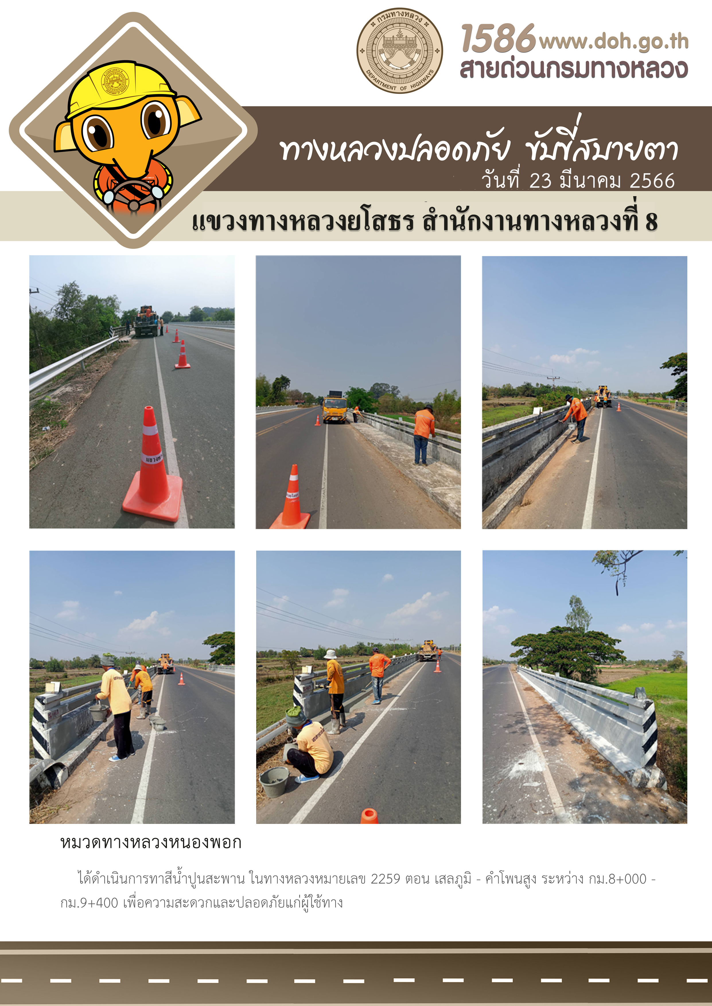 วันที่ 23 มีนาคม 2566 หมวดทางหลวงหนองพอก ได้ดำเนินการทาสีน้ำปูนสะพาน ในทางหลวงหมายเลข 2259 ตอน เสลภูมิ - คำโพนสูง ระหว่าง กม.8+000 - กม.9+400 เพื่อความสะดวกและปลอดภัยแก่ผู้ใช้ทาง