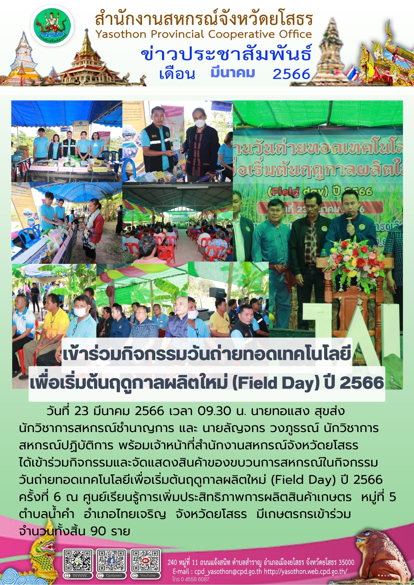 เจ้าหน้าที่สำนักงานสหกรณ์จังหวัดยโสธร เข้าร่วมกิจกรรมและจัดแสดงสินค้าของขบวนการสหกรณ์ในกิจกรรมวันถ่ายทอดเทคโนโลยีเพื่อเริ่มต้นฤดูกาลผลิตใหม่ (Field Day) ณ ศูนย์เรียนรู้การเพิ่มประสิทธิภาพการผลิตสินค้าเกษตร ตำบลน้ำคำ